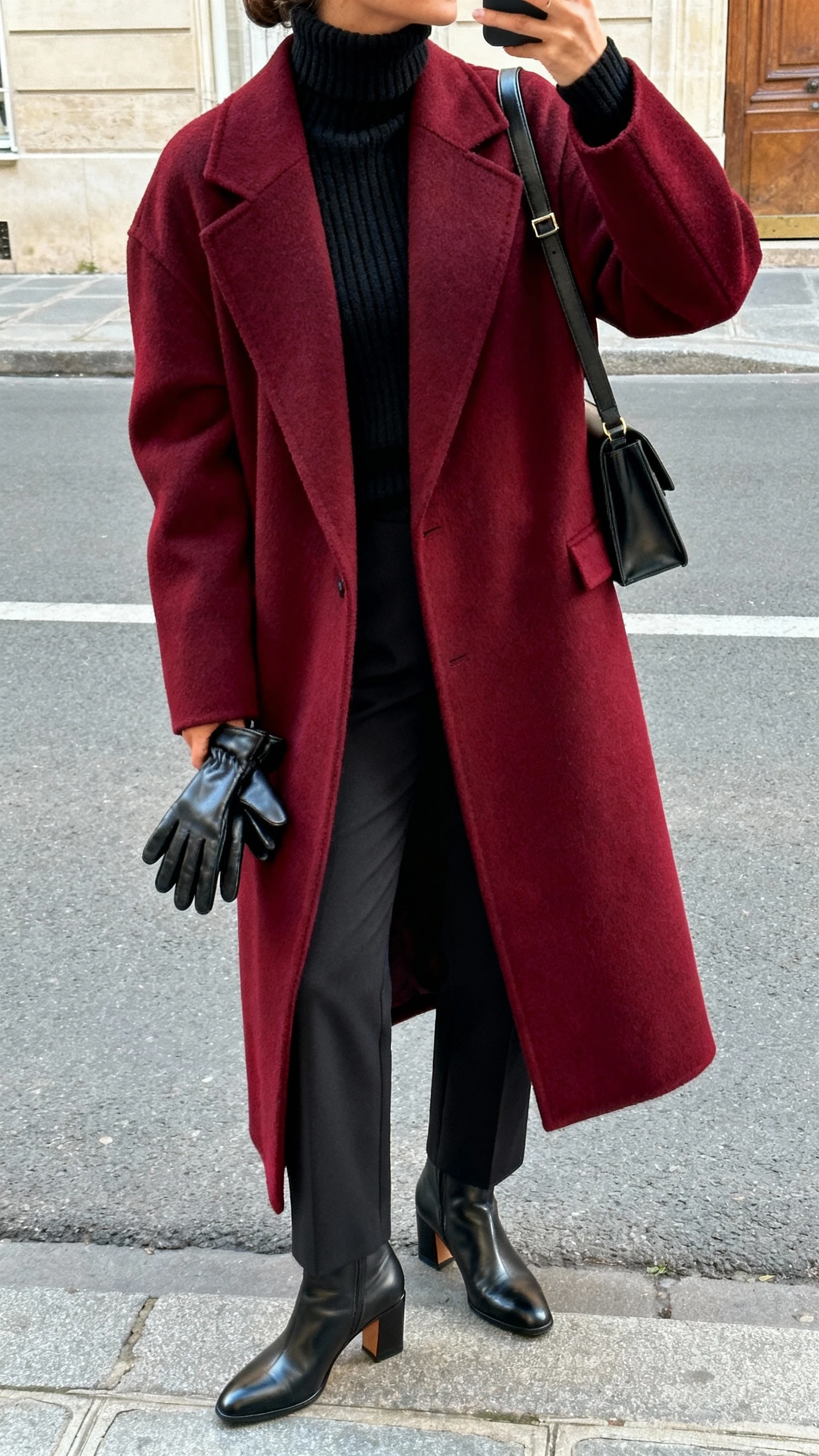 Perfect for commutes, quick client visits, and days you’re in and out of meetings. Swap the trousers for a knit midi skirt to soften the look, or pick a textured coat (herringbone, tweed) for subtle depth. A bright scarf can double as a conversation starter.