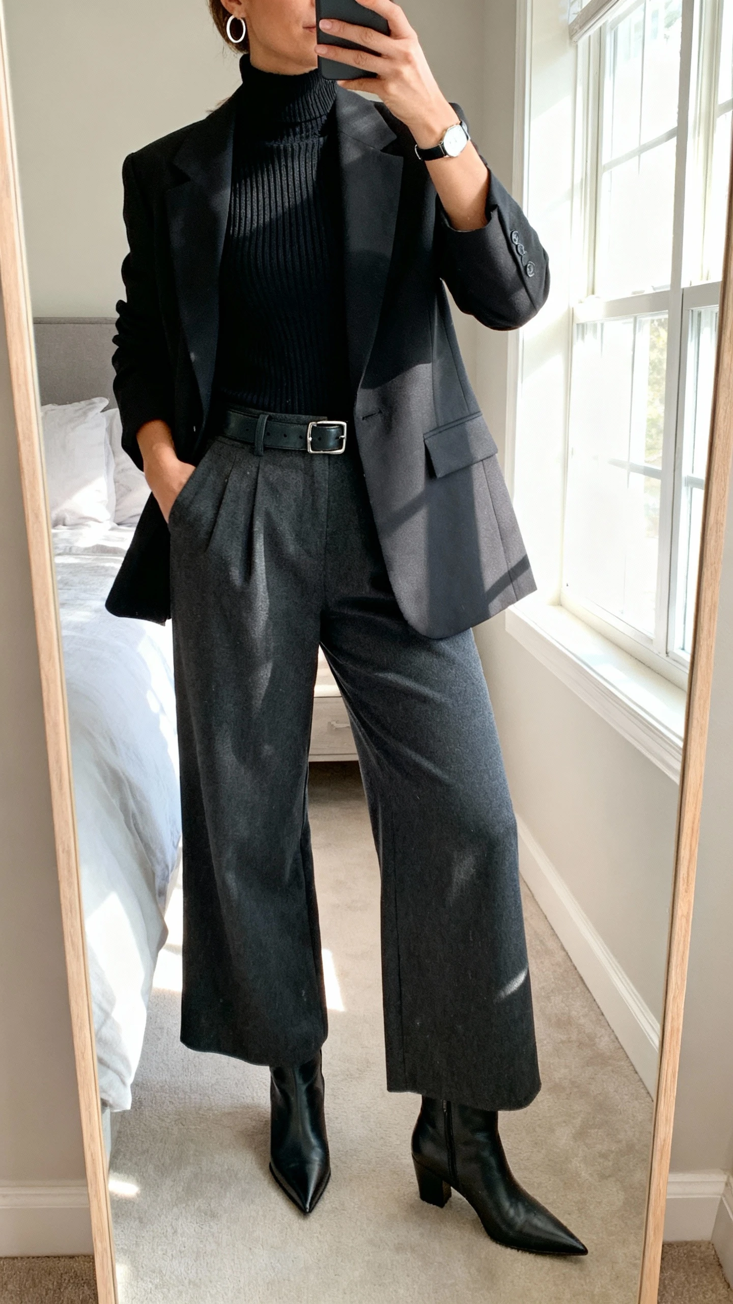 This look is perfect for client meetings, presentations, or anytime you want polish without fuss. Swap the turtleneck for a fine merino mock neck on warmer days, or try tonal dressing—cream on cream—for a luxe vibe. Trust me, it’s an instant confidence booster.