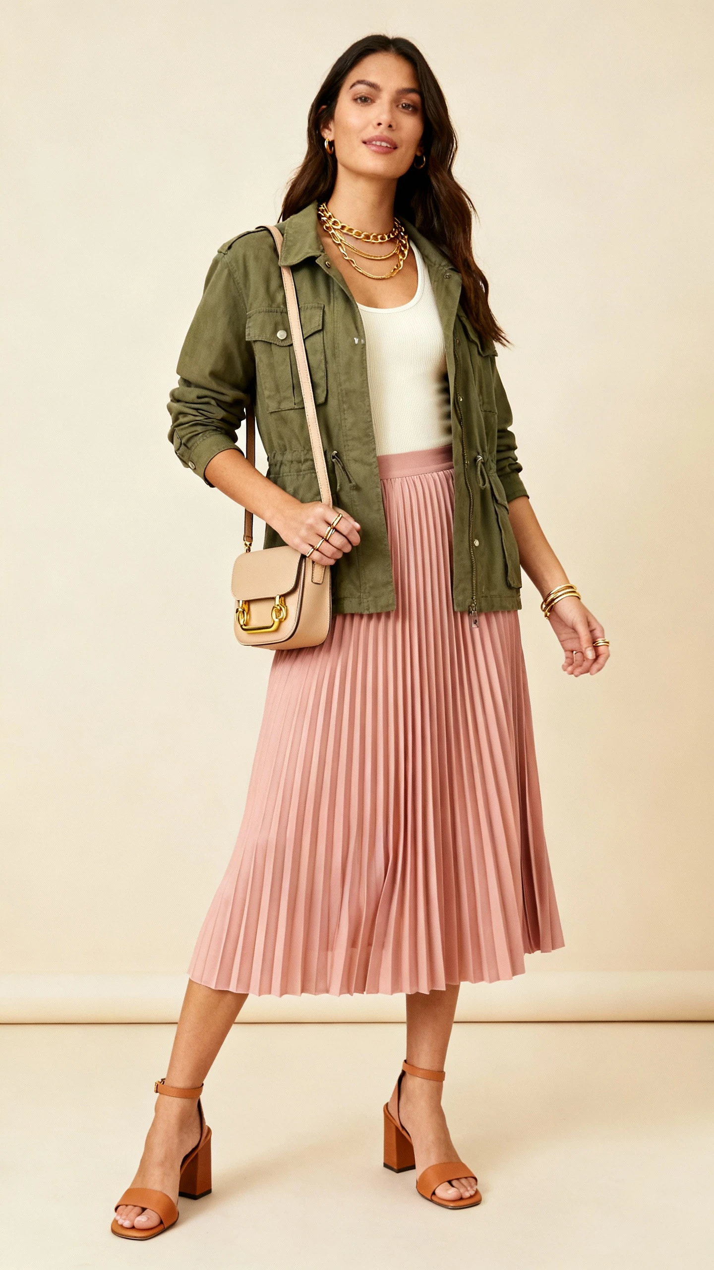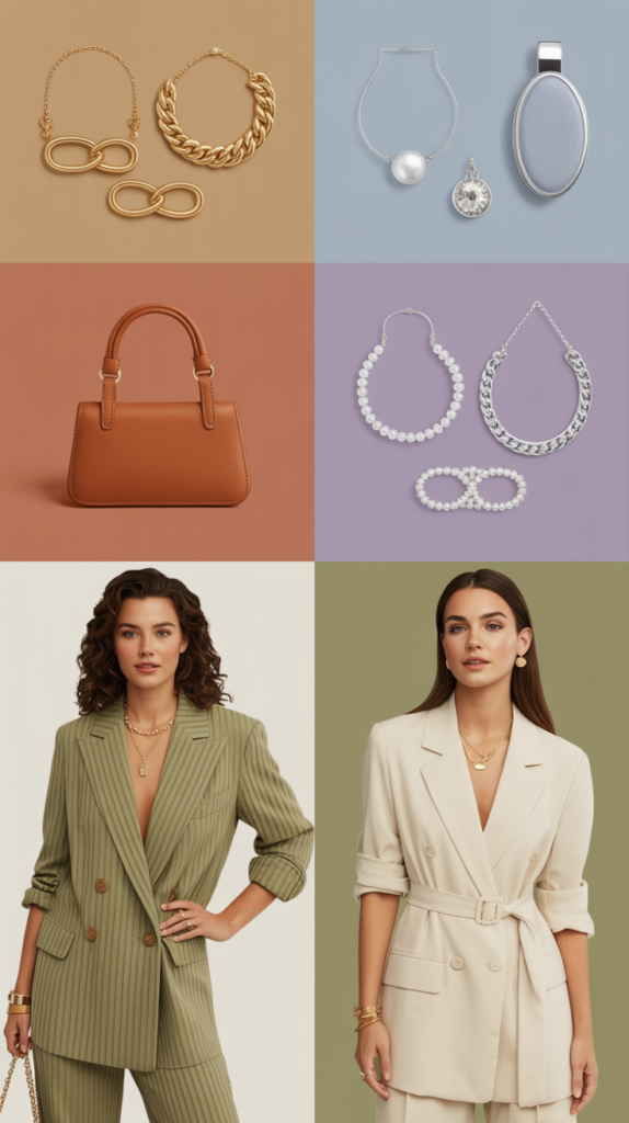 - Warm palettes (camel, sand, coral, terracotta): gold jewelry, tan/caramel shoes and bags.