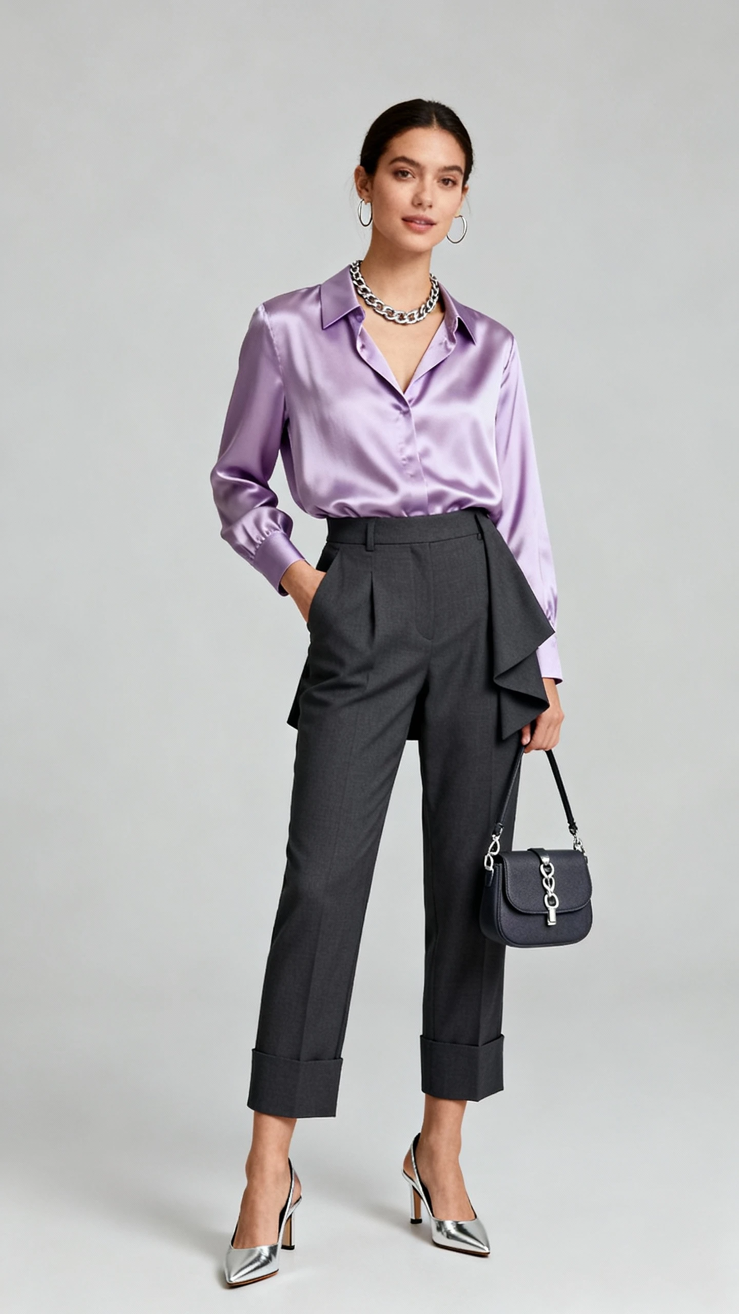 - Charcoal high-waisted trousers or a structured mini skirt