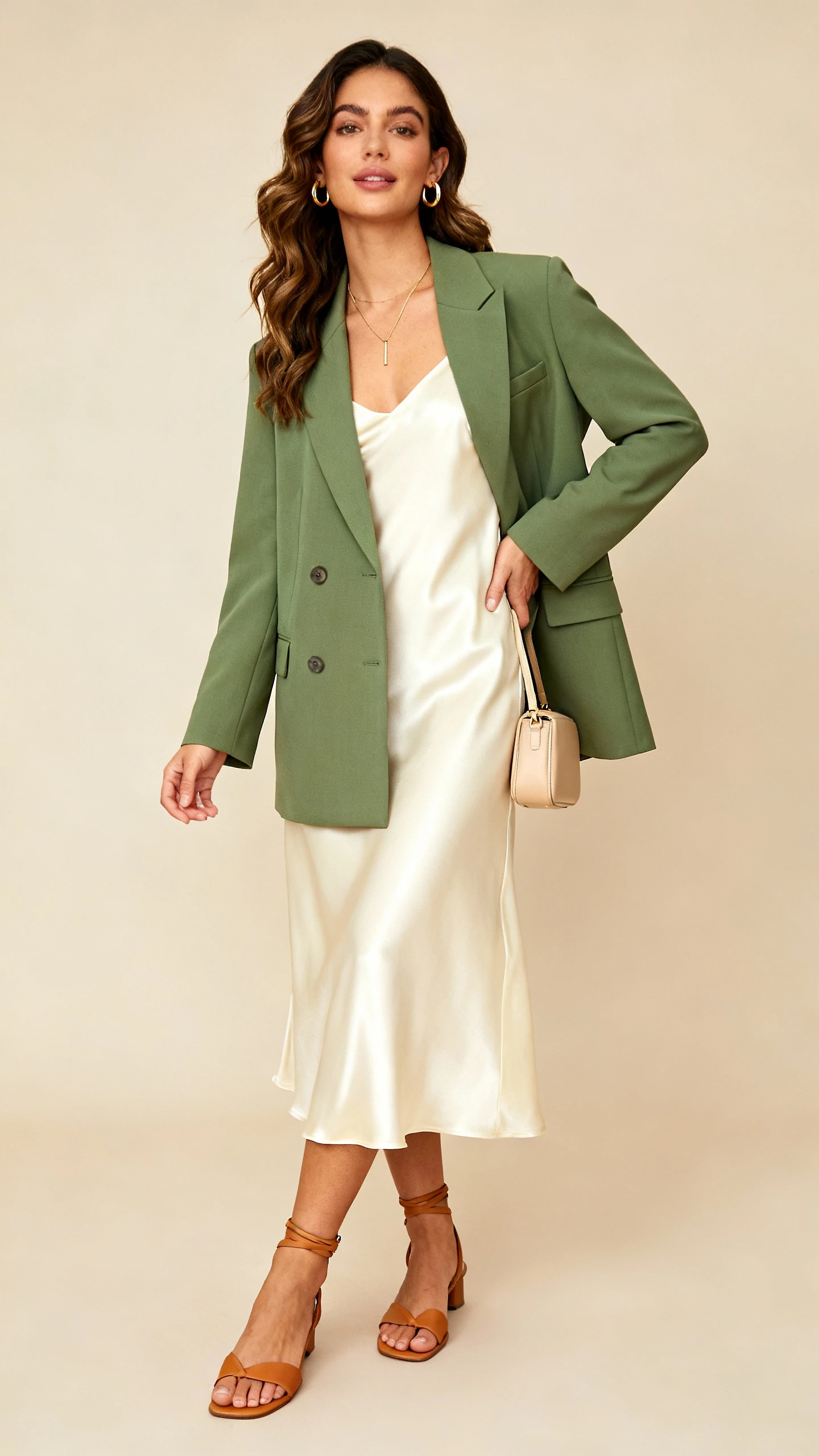- Cream satin slip dress or high-waisted cream trousers