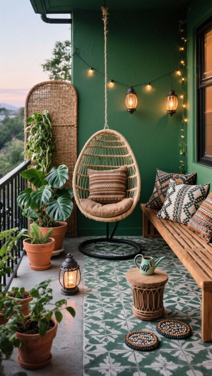Turn a small balcony into a leafy escape. Start with **deep green outdoor walls** and a **patterned cement tile floor**. Add a **hanging egg chair** with a mudcloth cushion and a **slatted teak bench** piled with patterned pillows.
