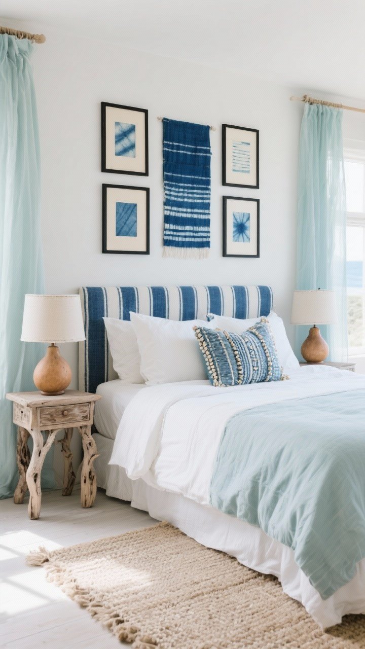 If ocean breezes had a décor style, this would be it. The palette leans **indigo and seafoam** with chalky whites, anchored by a **striped indigo kuba cloth** headboard and **white linen bedding** with **beaded lumbar pillows**.