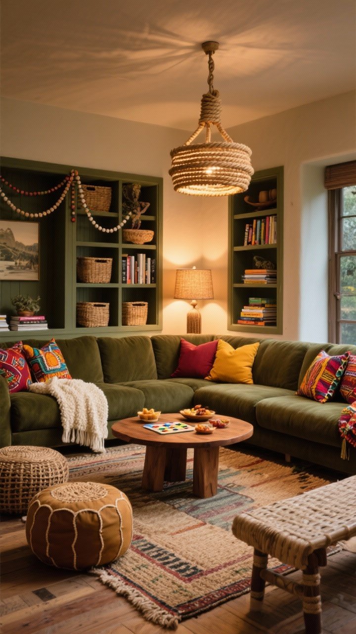 This cozy hub celebrates gathering and generosity. A **deep olive sectional** wraps the room, peppered with **colorful Ankara-print pillows** and a **cream bouclé throw** for softness.