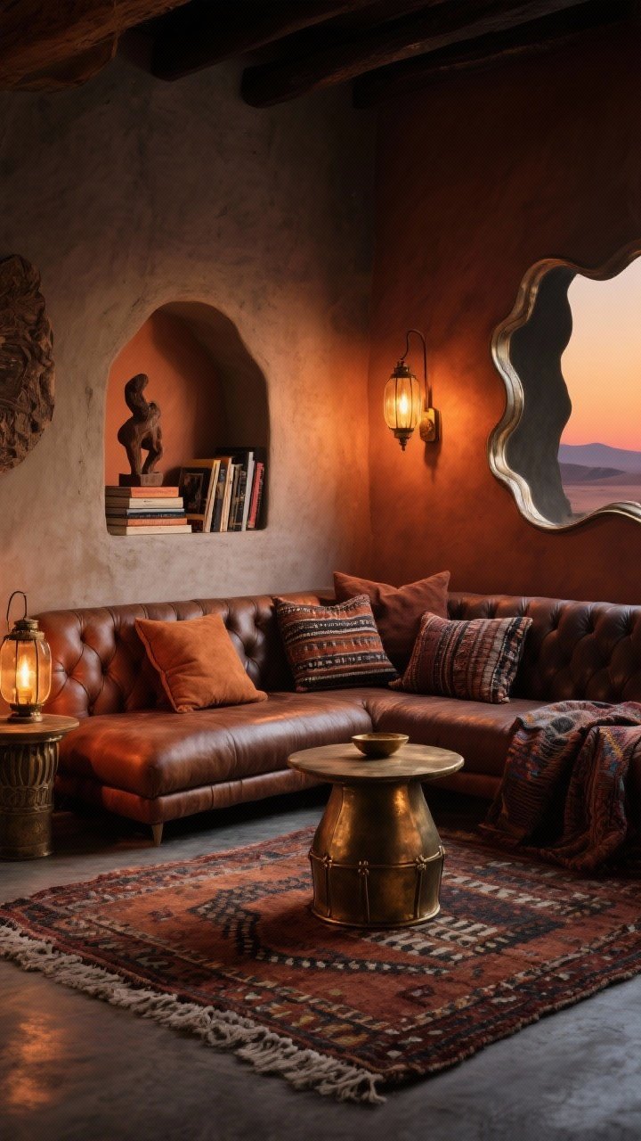 This moody lounge is all **burnt sienna**, **caramel**, and **inky charcoal**. A **tufted leather floor sofa** keeps seating low and relaxed, layered with **Bogolan pillows** and a **thick Berber-style rug** underfoot.