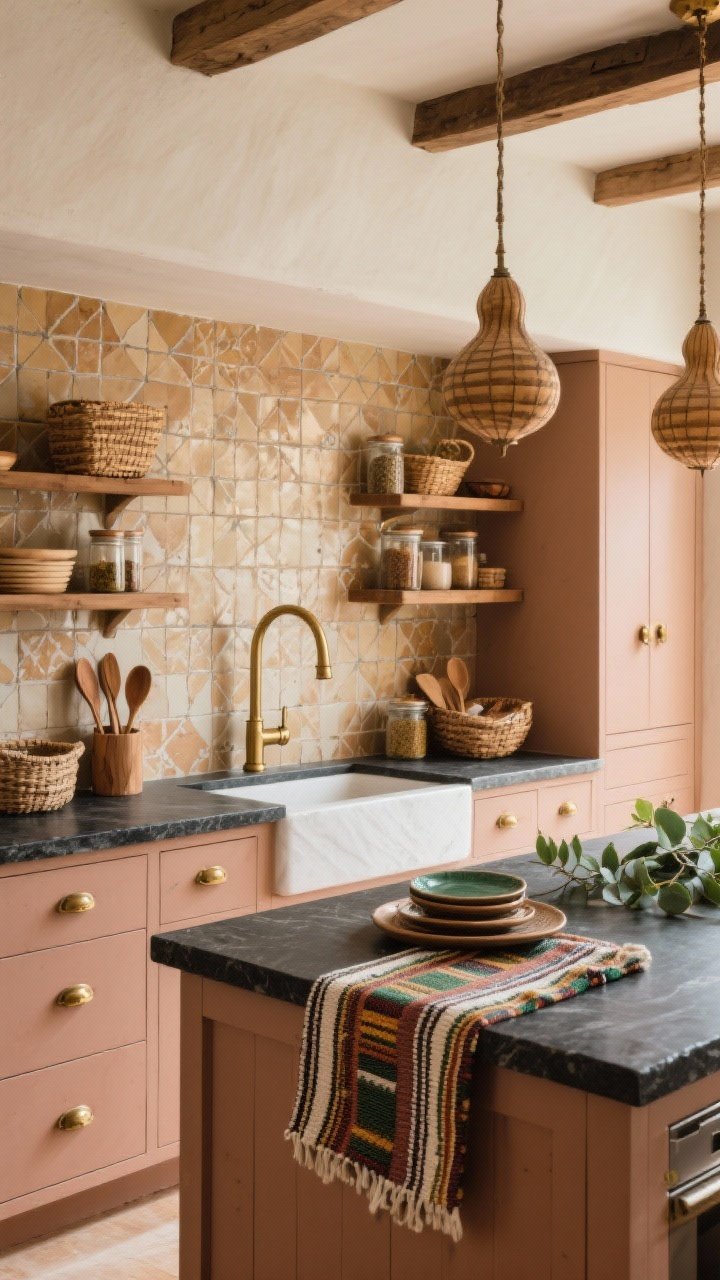 This kitchen blends rustic artisan charm with everyday function. Picture **matte clay-colored cabinets**, **open wood shelves**, and a **handmade zellige tile backsplash** in warm sand tones.