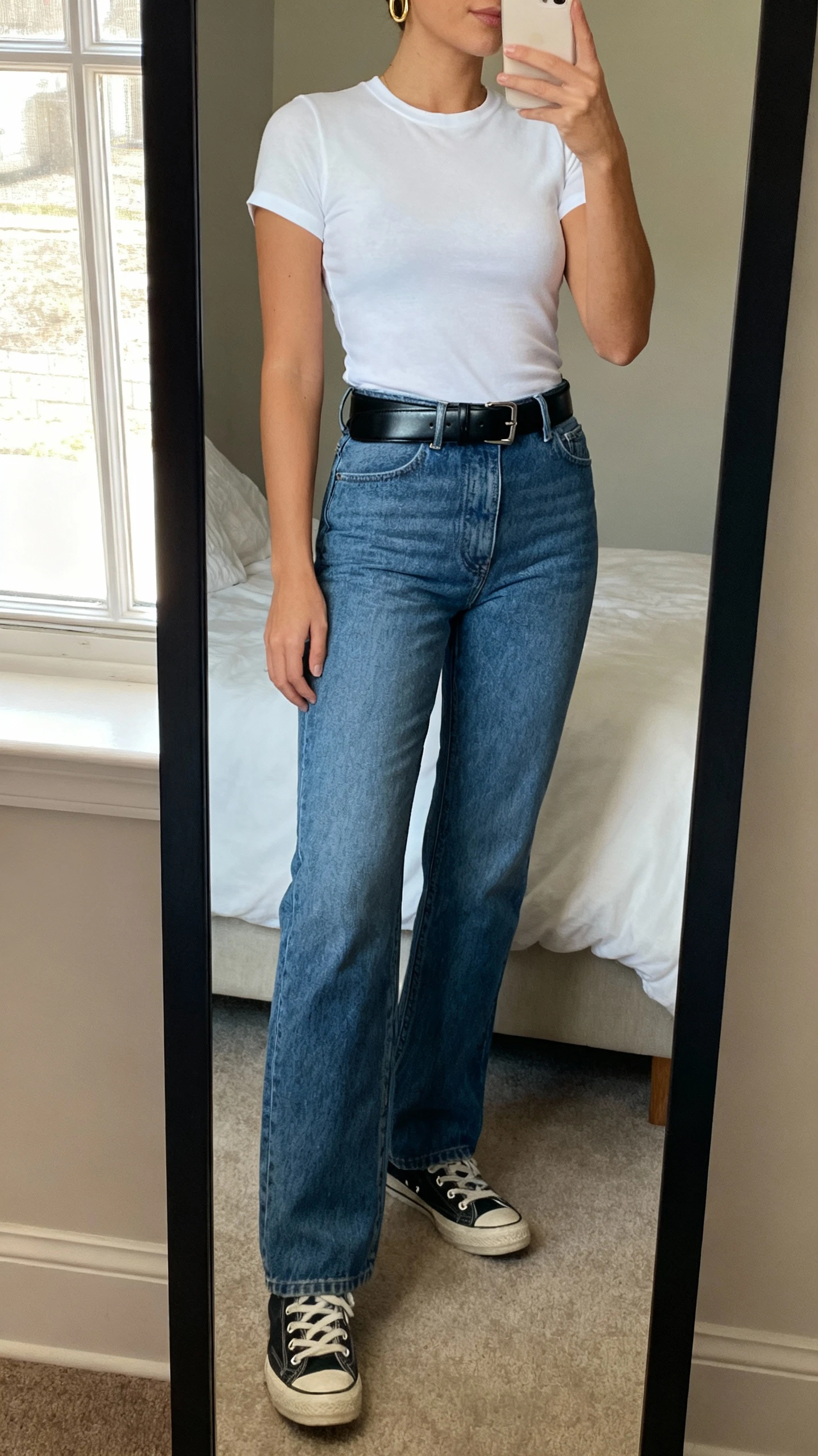 Think minimal, clean, and quietly expensive-looking without the price tag. High-waisted straight-leg denim with a sleek belt is the instant “I know what I’m doing” combo. It flatters your waist, elongates your legs, and plays well with everything from tees to blazers.