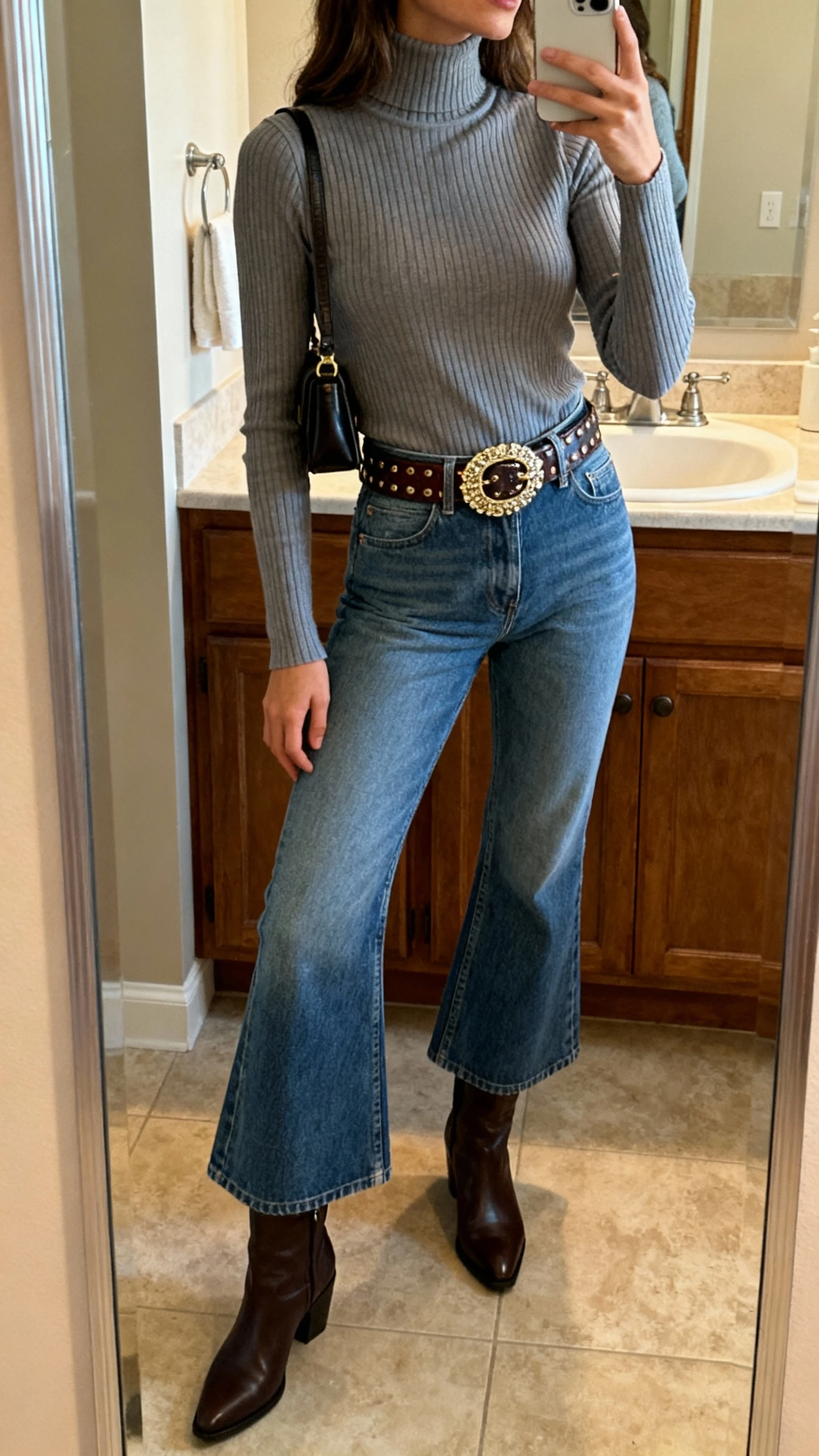 2. Cropped Flare Denim With Statement Belt That Does The Heavy Lifting