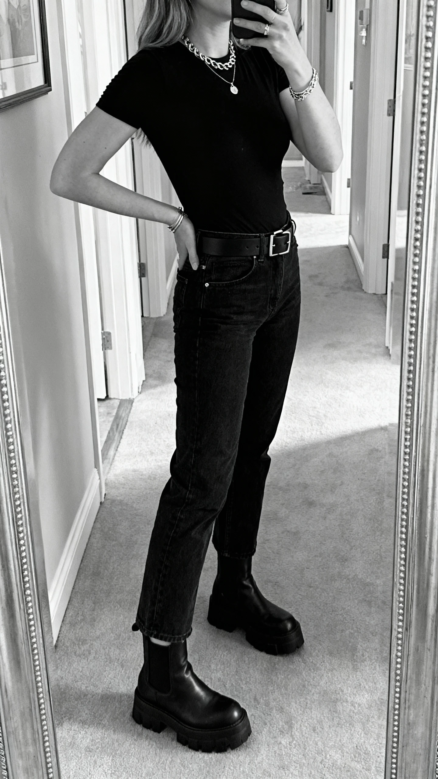 All black is the shortcut to sleek. Black denim with a black belt is cohesive, elongated, and seriously flattering. It’s the easiest way to look pulled together with almost zero effort—trust me, it never fails.