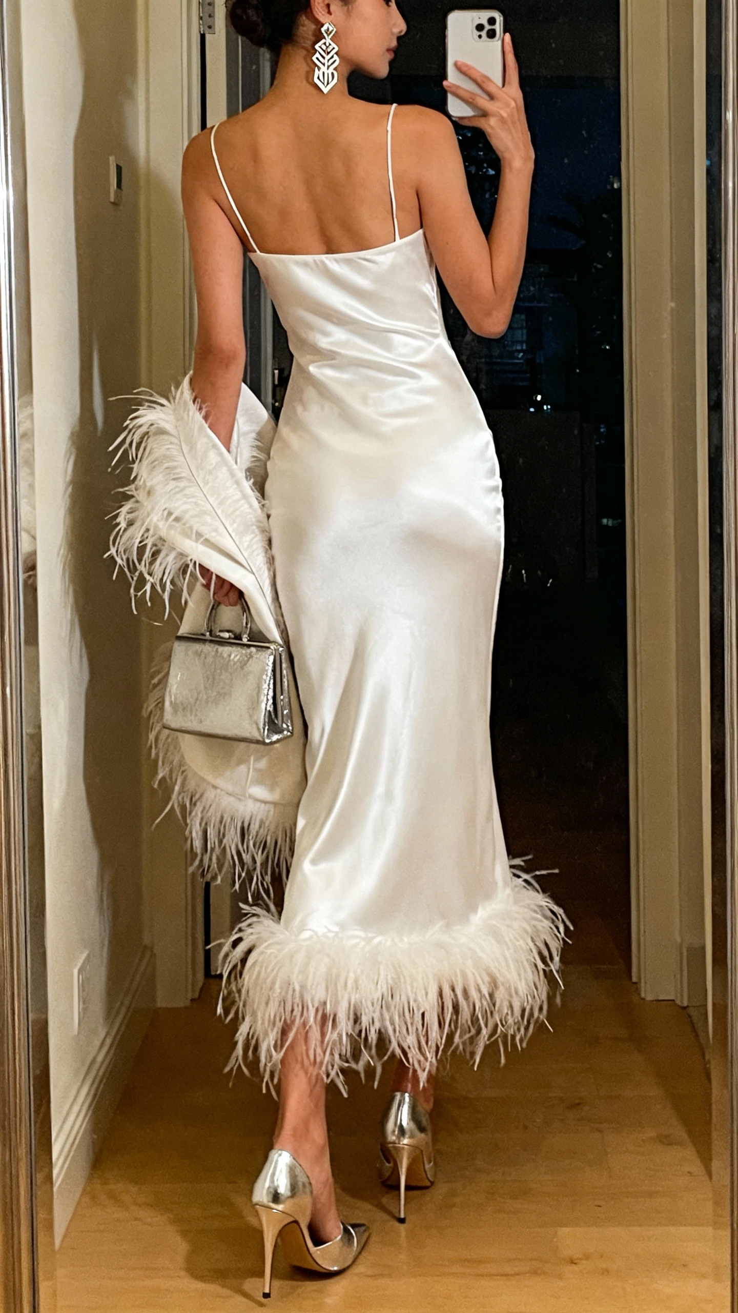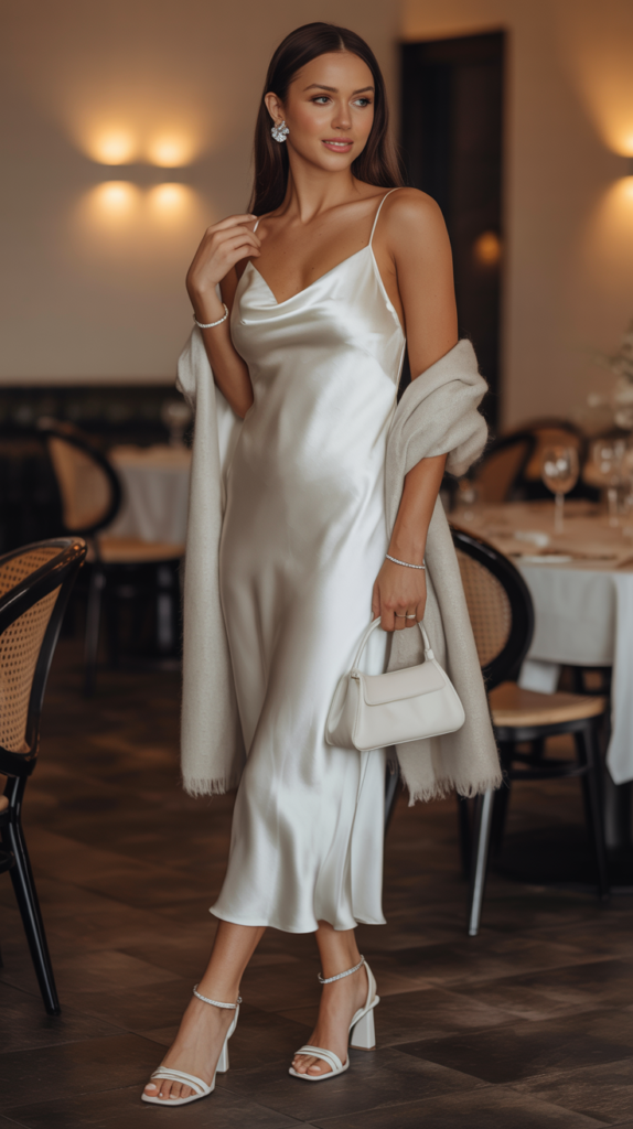 This is the “I woke up elegant” look. A fluid white satin slip dress with modern, clean lines brings that effortless luxury. It’s simple, it’s sleek, and it skims your shape without shouting for attention—exactly the kind of dress that looks incredible in photos and feels like air.