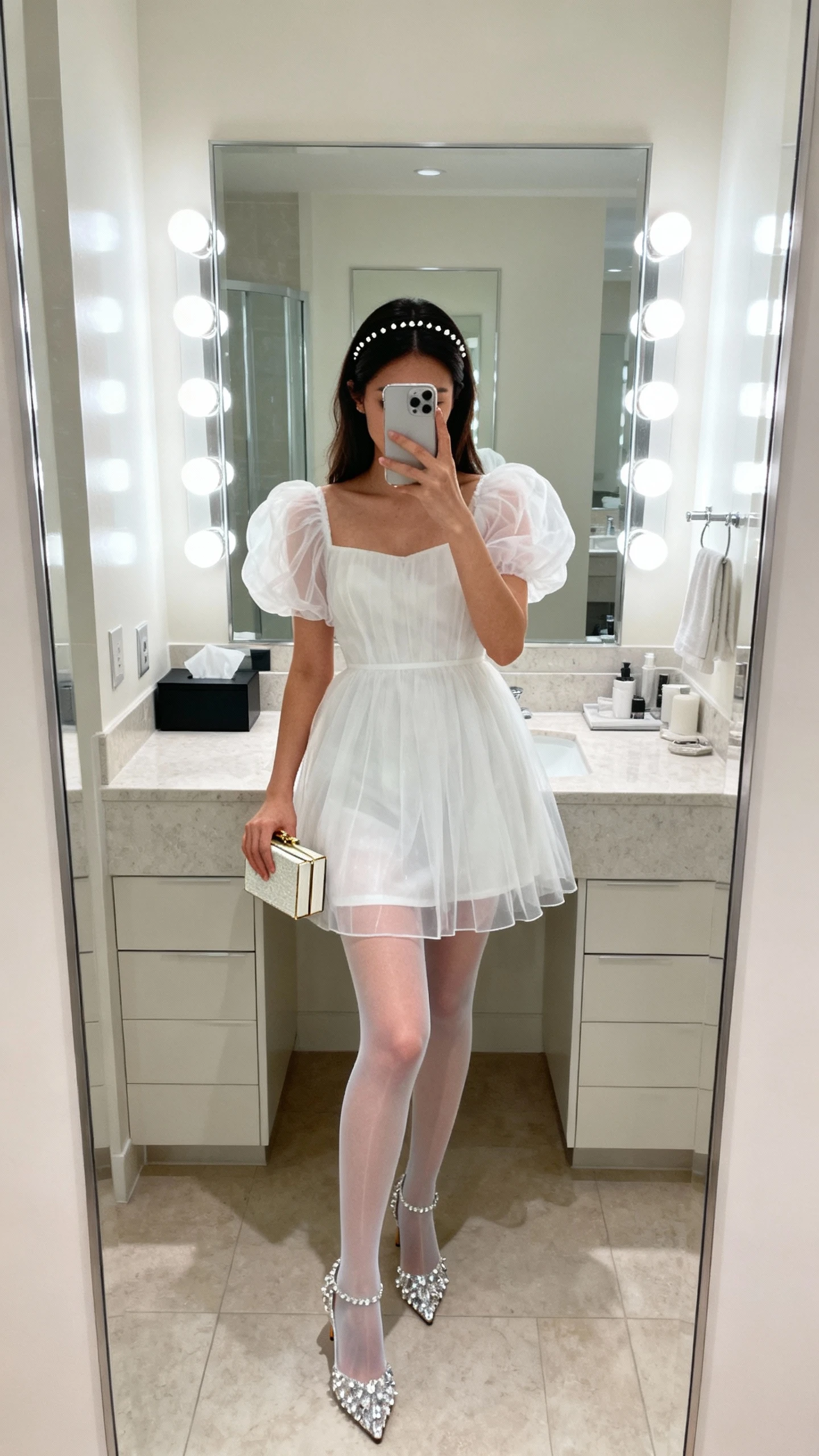 If you want playful and pretty, this one’s your girl. A white organza mini with puff sleeves or a flounced hem gives you fashion-forward sweetness with a touch of drama. It’s flirty, photogenic, and absolutely dinner-party ready.