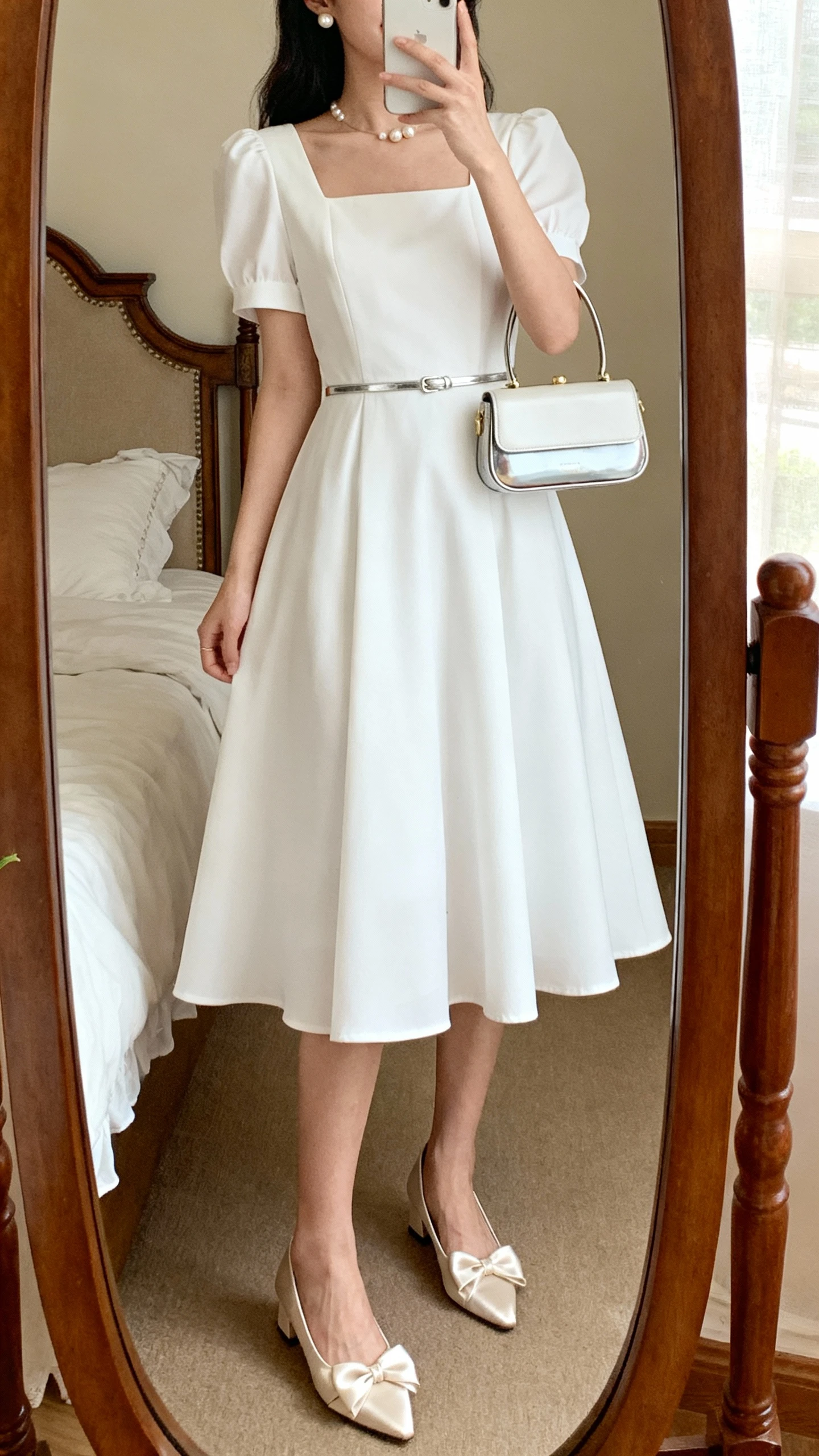 - White tea-length dress (fit-and-flare, square or bateau neckline)