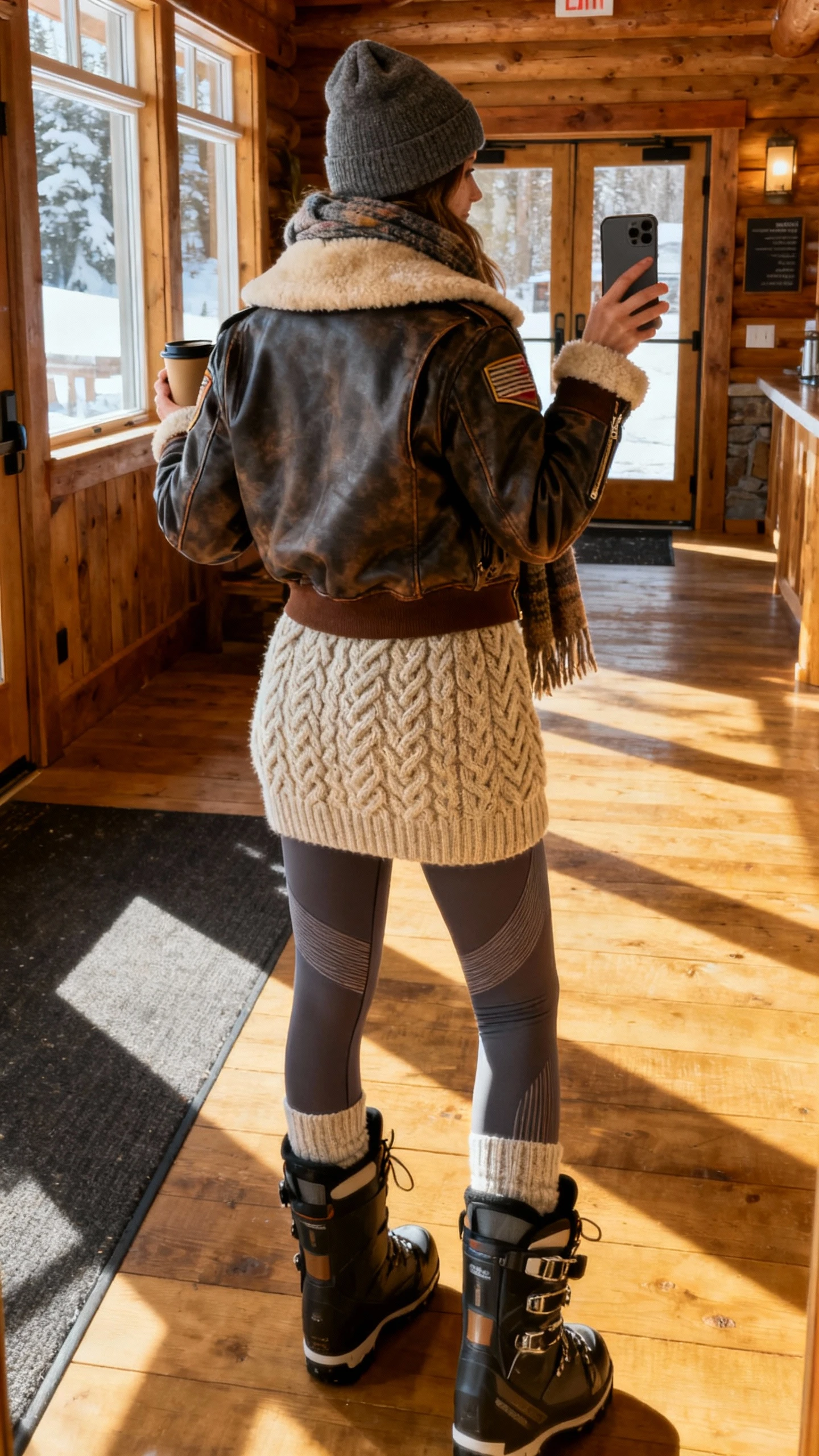 This one screams cozy chalet without ever stepping onto a ski lift. A shearling-lined aviator plus a chunky knit is functional and photogenic—like hot cocoa in outfit form.