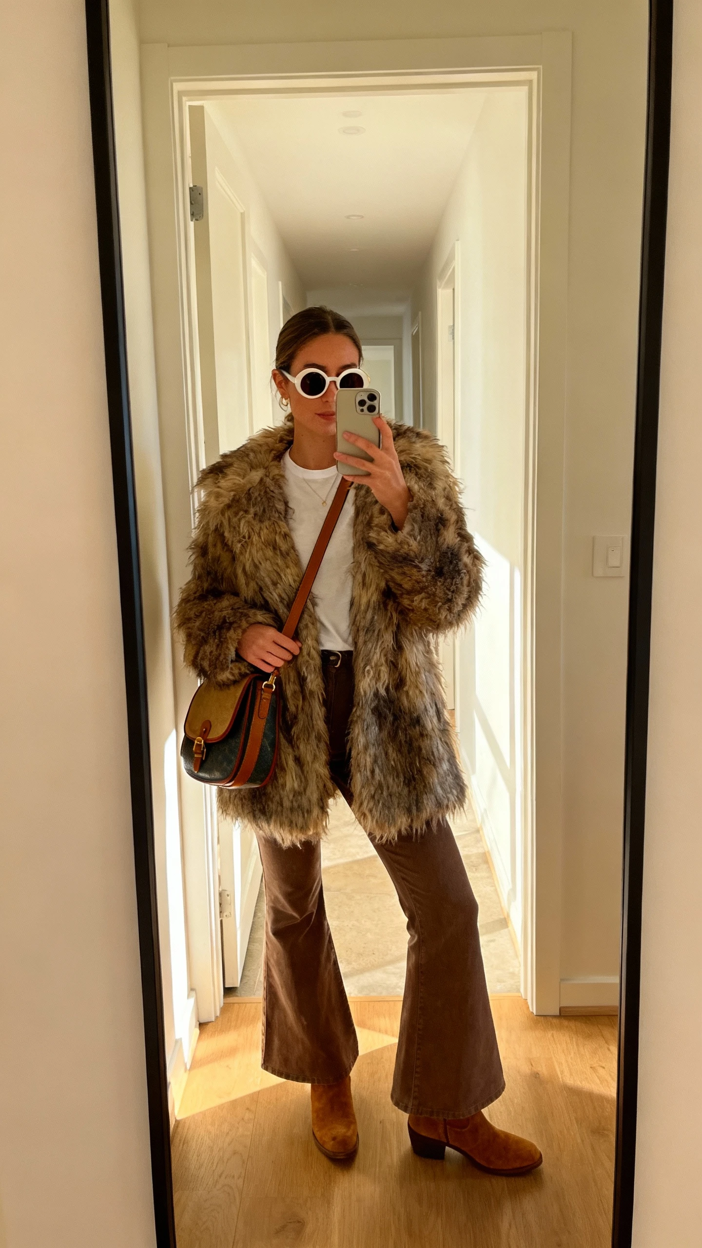 Channel retro elegance without feeling costume-y. A shaggy fur and flare pants combo brings back 70s charm in a modern way—playful, warm, and unapologetically fun.