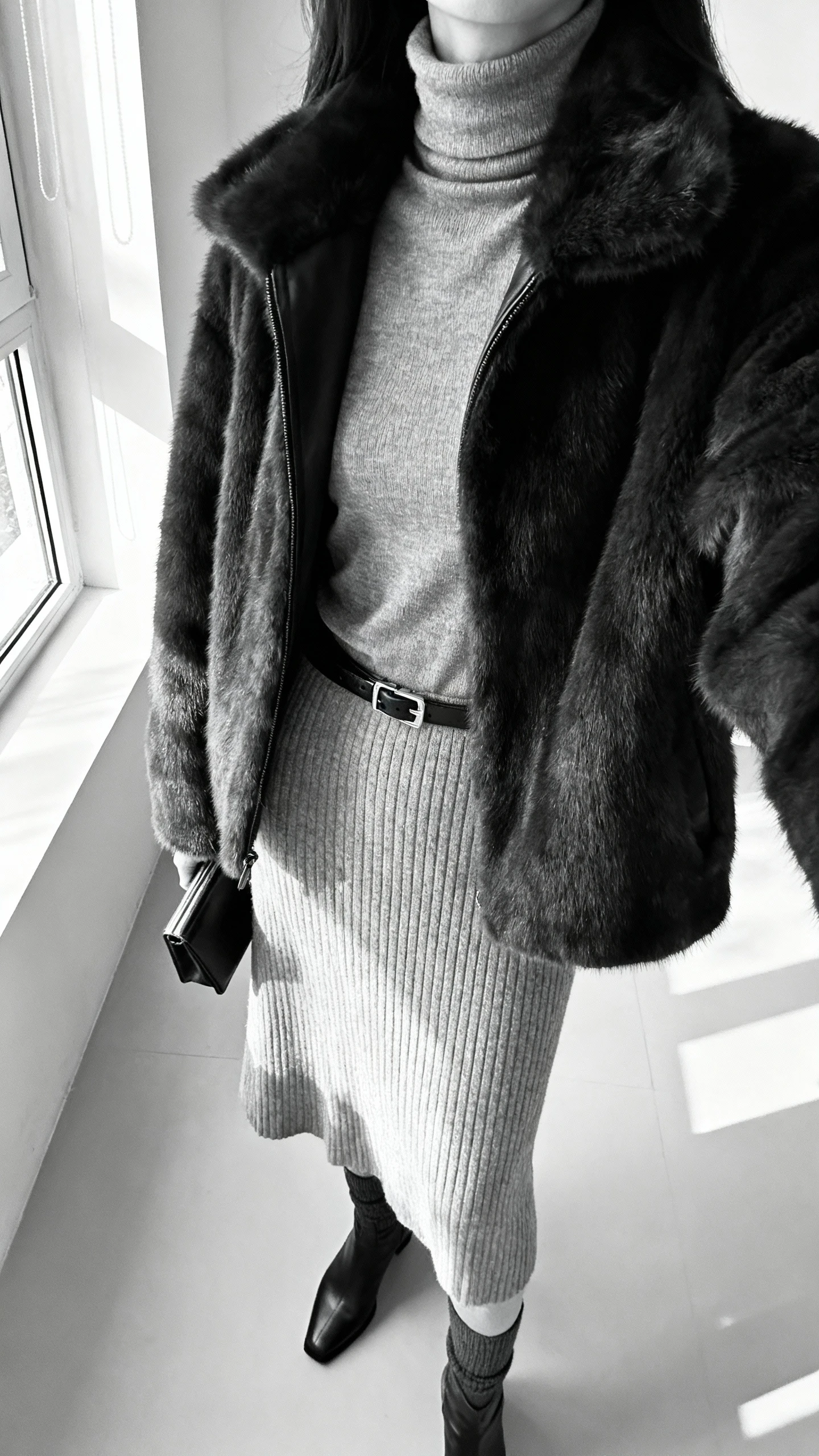 6. Minimalist Luxe: Monochrome Fur + Knit Midi Skirt