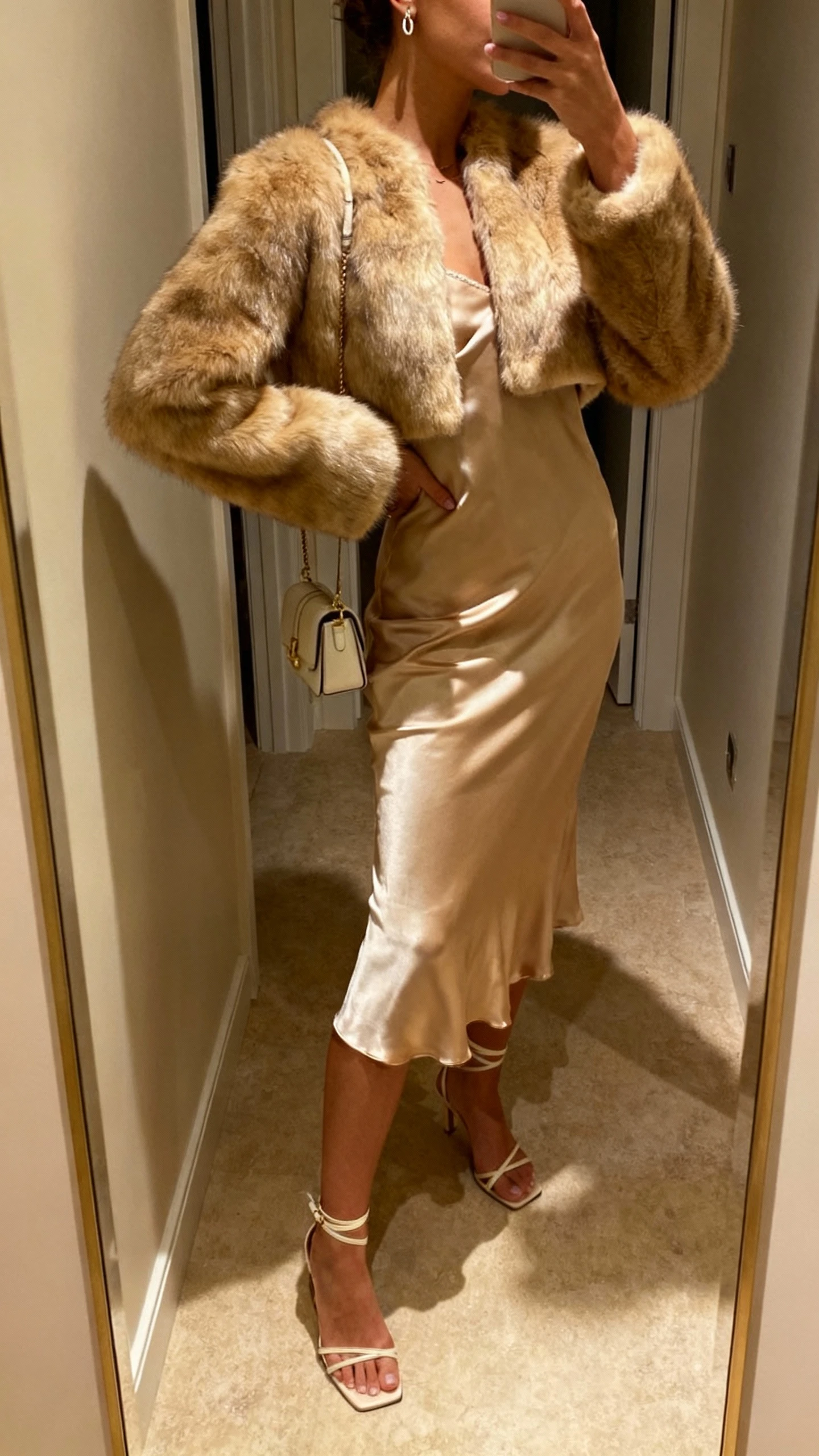 There’s something irresistible about a cropped fur over a satin slip—it’s 90s glam with modern polish. It moves beautifully, photographs like a dream, and whispers “I’ve got reservations.”