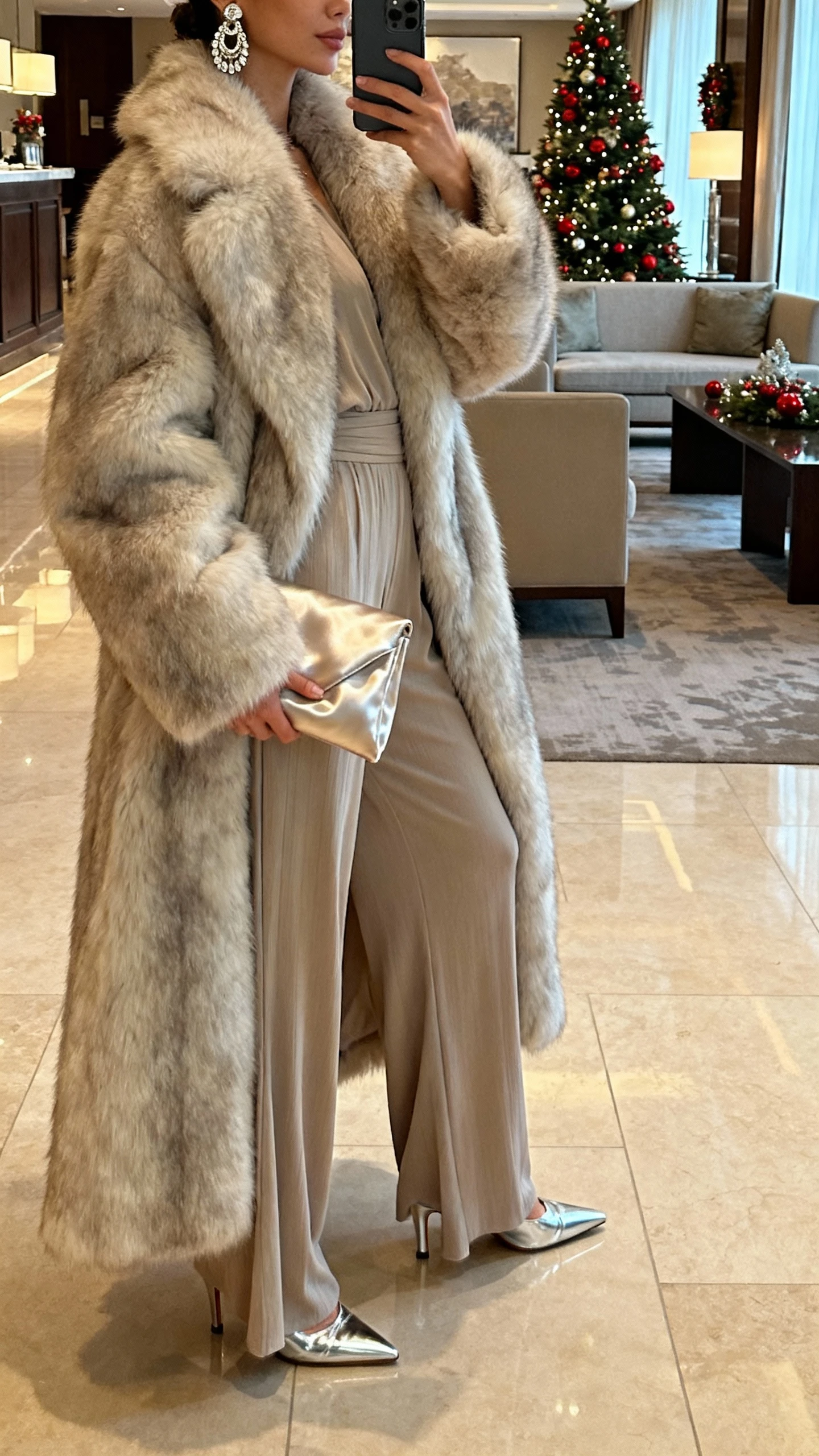 9. Holiday Glamour: Floor-Sweeping Fur + Wide-Leg Jumpsuit