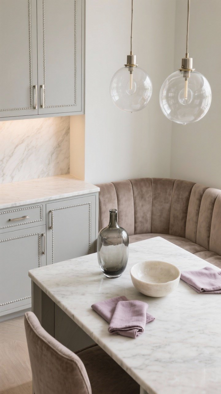 Hardware goes brushed nickel with thin bar pulls that feel bespoke. A curved banquette nook upholstered in taupe velvet whispers hotel suite, but in a soft, livable way.