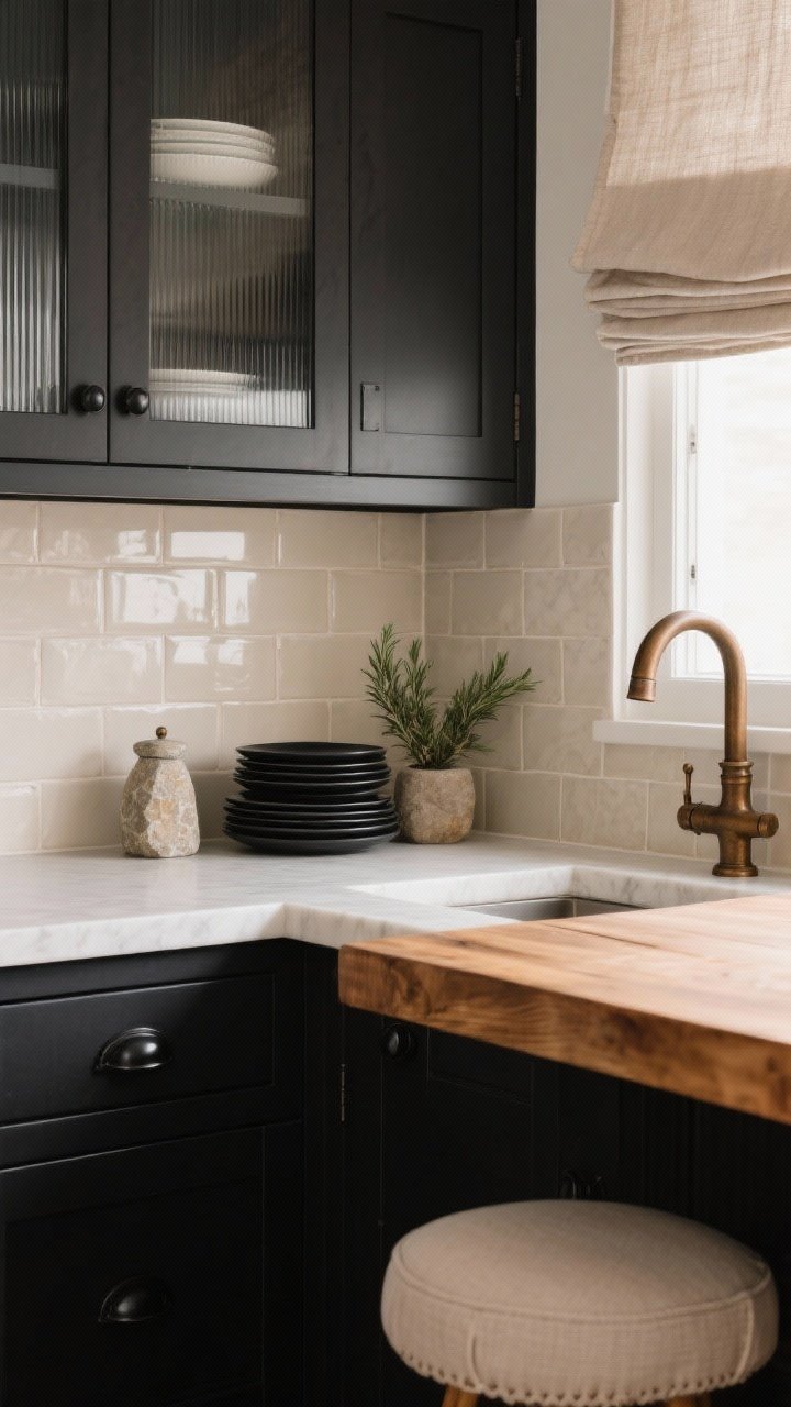 Quiet drama, perfectly tailored. Base cabinets in soft black (think rich charcoal, not jet) pair with a matte ivory quartz counter and a linen-toned zellige backsplash that shimmers just enough.