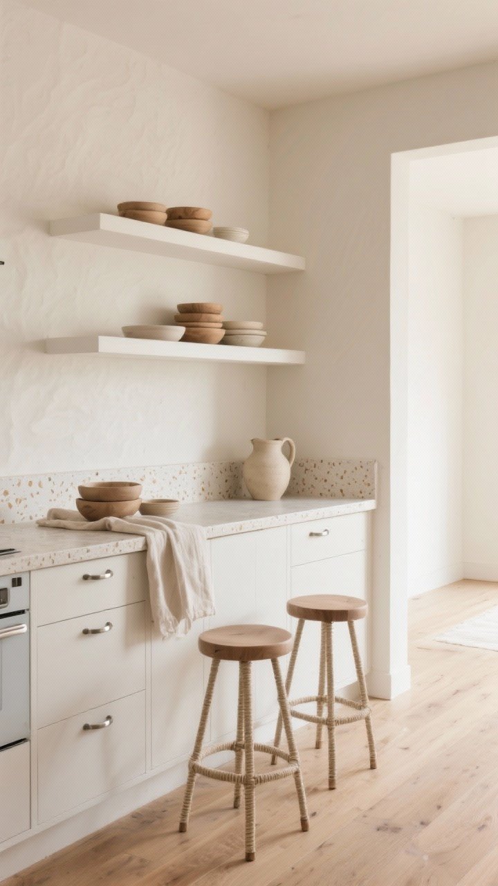 Think soft neutrals layered like beach sediment. Lower cabinets in whitewashed oak, upper cabinets swapped for open white oak shelves with rounded edges, and walls in a breathable limewash beige that changes with the light.