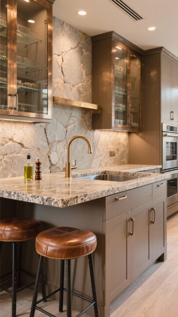 Luxurious, layered, and subtly luminous. Lower cabinets in warm taupe anchor the space, while upper doors are soft bronze metal frames with clear glass—think artisan workshop meets boutique apartment.