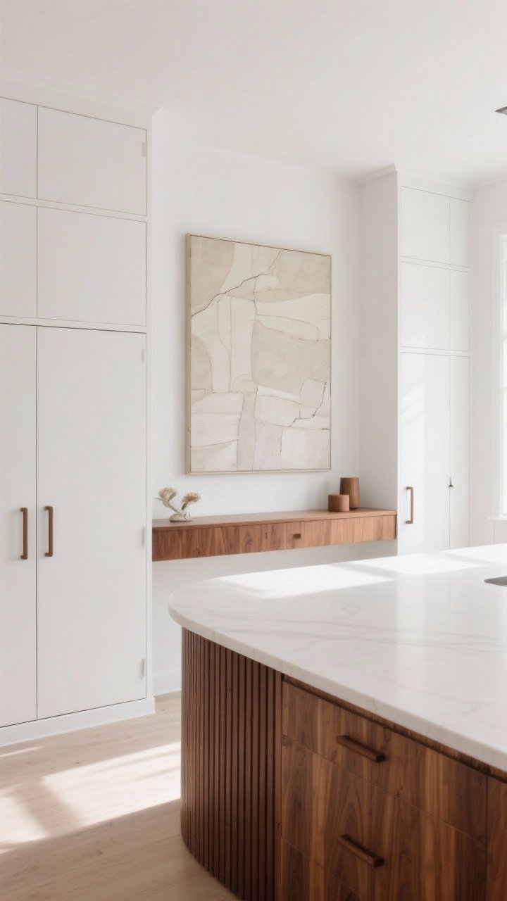 Instead of upper cabinets, add a long, low floating walnut credenza shelf above the counter for display. The island gets a softly curved end, with ribbed wood paneling that catches the light.