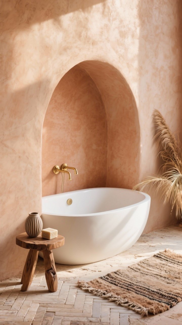 Soft, sun-warmed elegance. A sculpted white tub nestles inside a shallow plaster arch niche, with microcement walls in pale terracotta that feel artisan and airy.