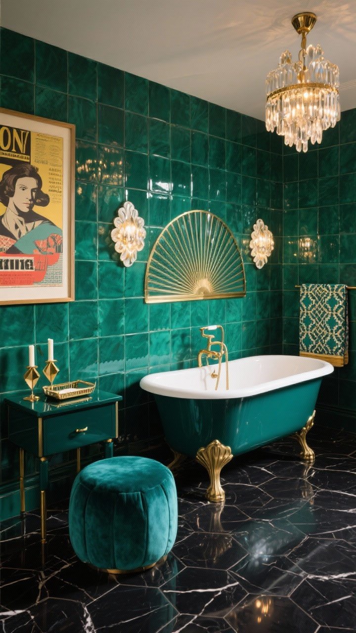 Flooring in black hex marble grounds the color, while scalloped sconces and a faceted chandelier add sparkle. Finish with plush teal velvet poufs, framed vintage posters, and a lacquered side table.