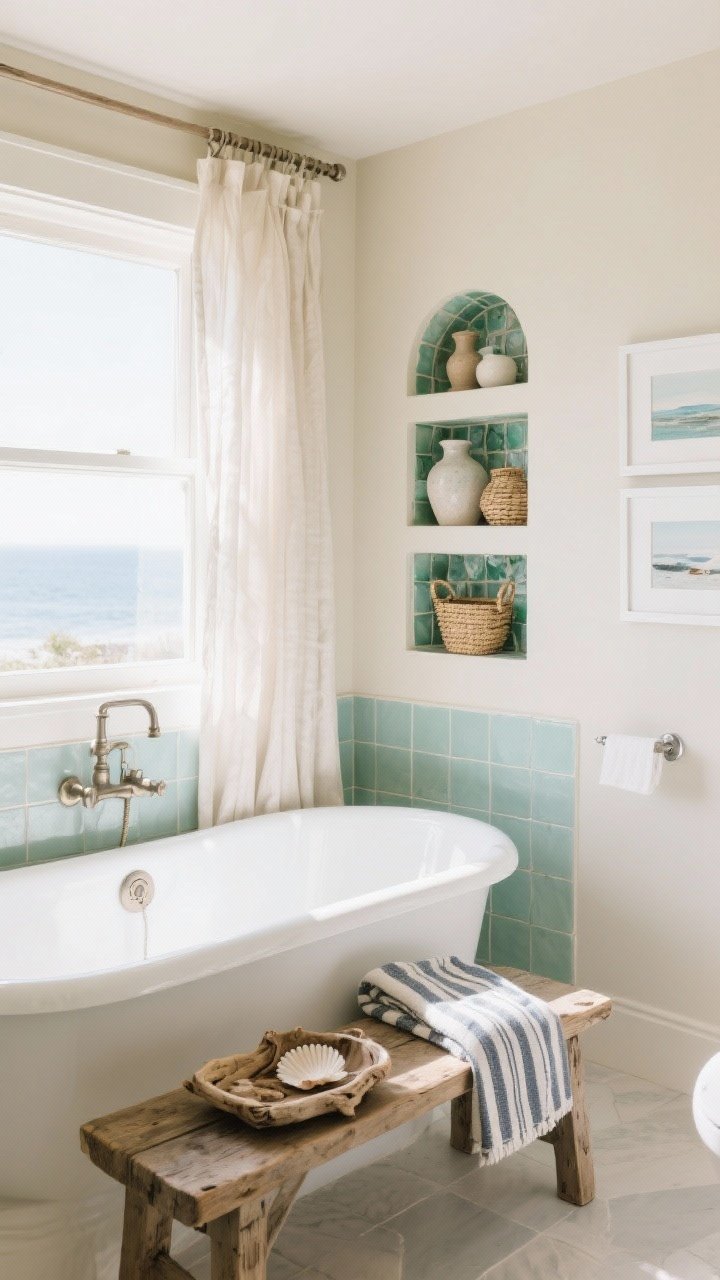 - Finishing Touches: A driftwood tray, striped Turkish towels, and coastal artwork in white frames