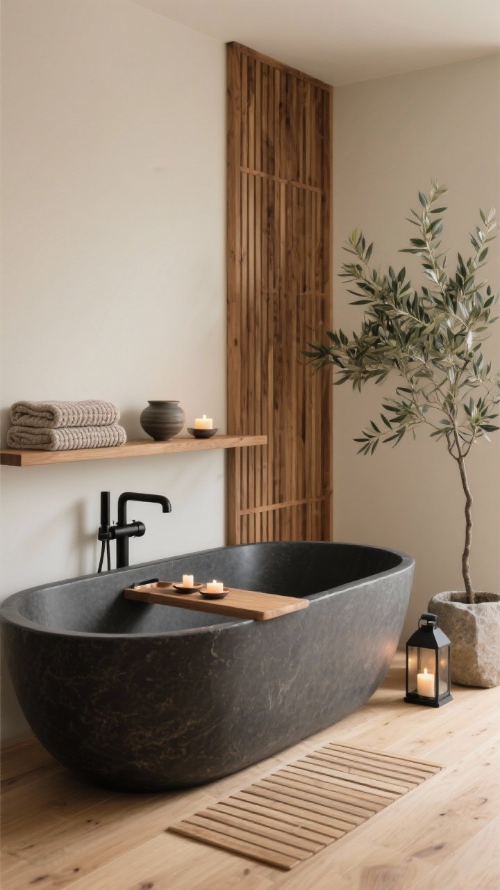 Keep everything minimal: matte black fixtures, a floating oak shelf with soft cotton towels, and a ceramic tray with tea lights. A potted olive tree adds a gentle green moment without breaking the calm.