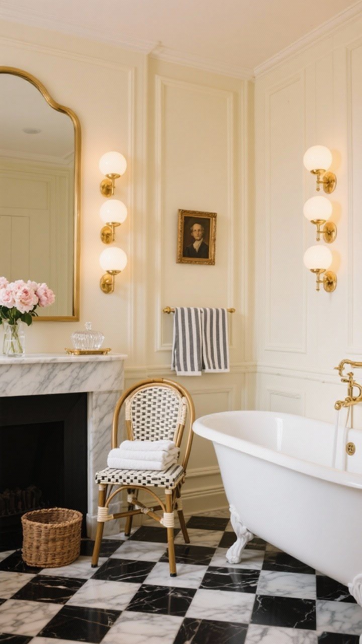 A petite bistro chair holds towels, and a globe sconce trio flanks a thin brass mirror. Add a marble mantel ledge with a small portrait and a cluster of peonies for an effortless, lived-in vibe.