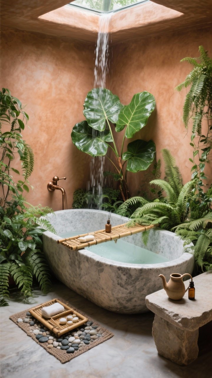 Turn your bath into a garden sanctuary. A deep soaking tub carved from light granite anchors the room, surrounded by layered greenery—ferns, trailing pothos, and a statement fiddle-leaf fig.