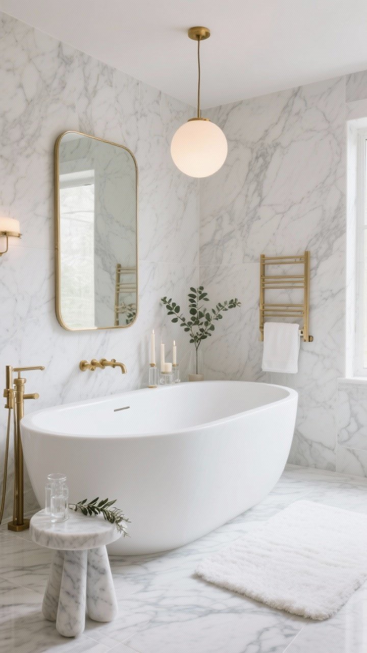 - Finishing Touches: A low marble stool with eucalyptus, linear candle holders, and a plush white bath mat