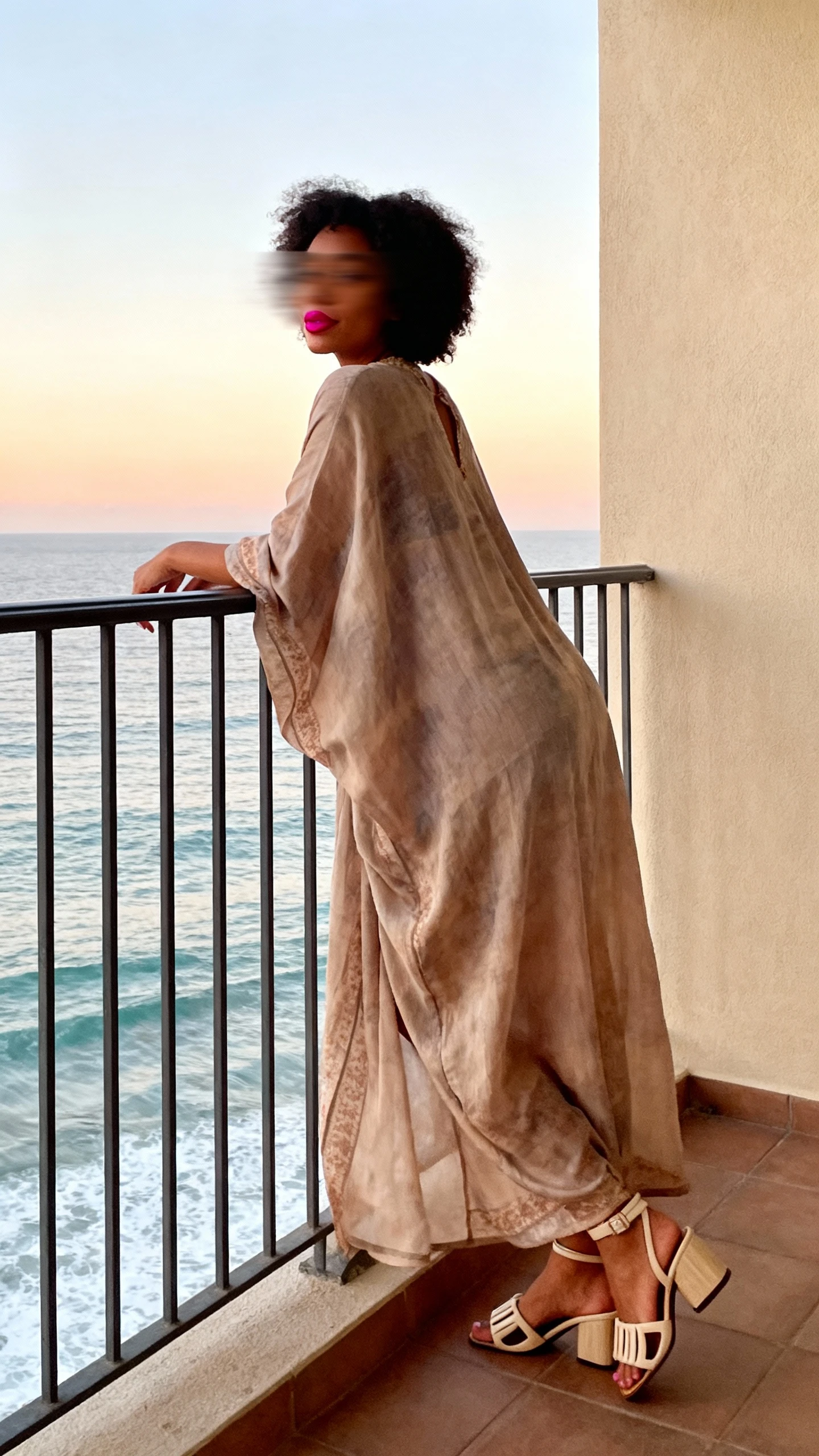 A kaftan is the ultimate resort flex: minimal effort, maximum presence. Go for a fluid, elegant version with a deep V or embellished neckline, and let the accessories do the talking. It’s as comfortable as loungewear and as striking as a gown.