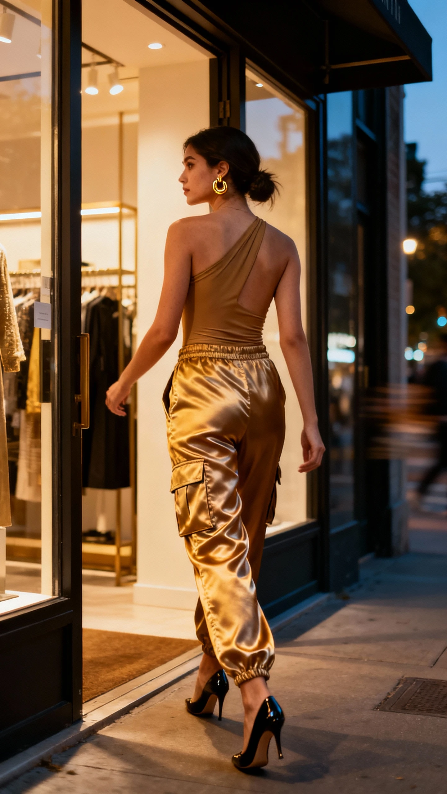 6. Satin Cargo + One-Shoulder Bodysuit For Sporty-Glam Nights