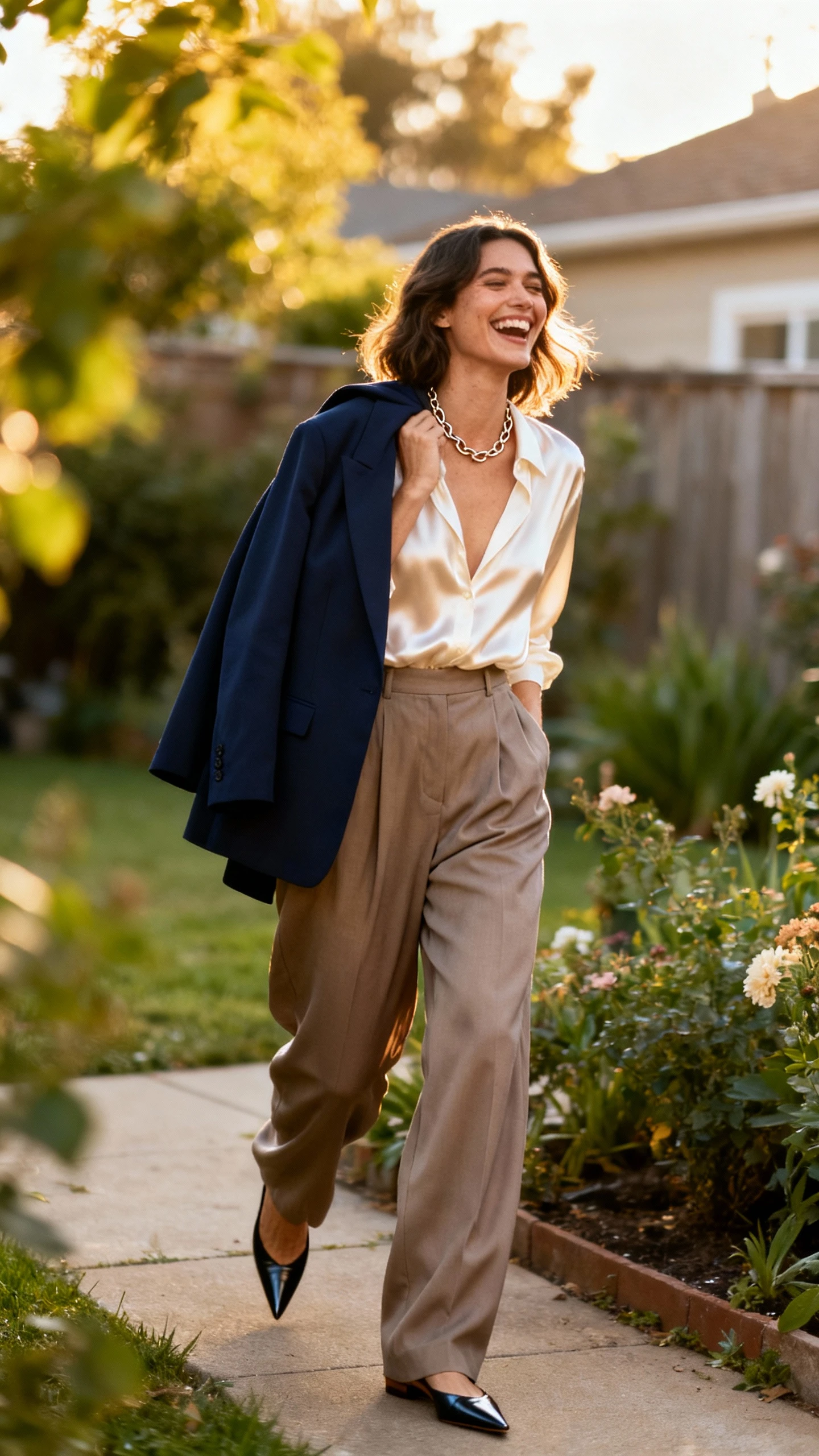 This is the uniform for people who want style with zero effort. A soft-shoulder blazer paired with puddling trousers and clean leather sneakers gives you that easy, cool-girl energy. It’s the outfit that gets compliments at the grocery store and the airport lounge.
