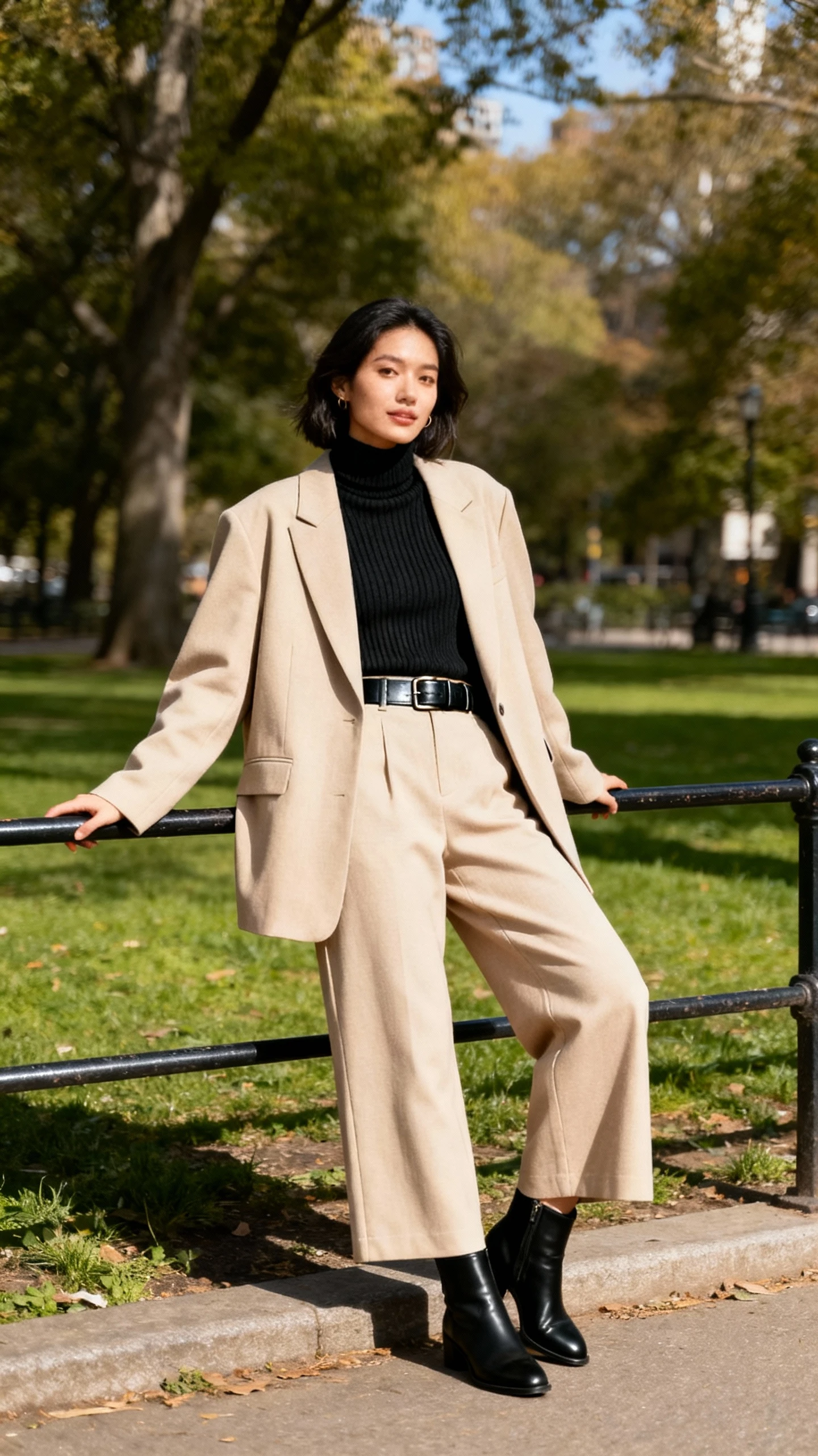 This one’s a masterclass in quiet luxury. A cream oversized blazer with flowy wide-leg trousers gives you that air-brushed, cloudlike silhouette. Keep everything tonal so the details—sharp creases, smooth textures—do the flexing for you.