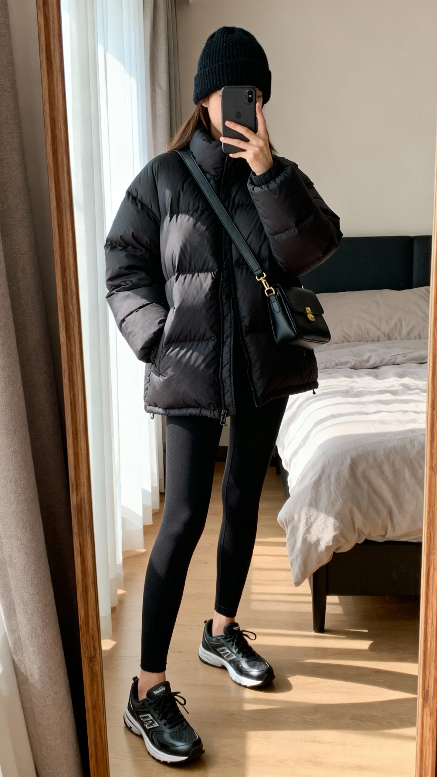 - Matte black puffer jacket (hip-length or mid-thigh)