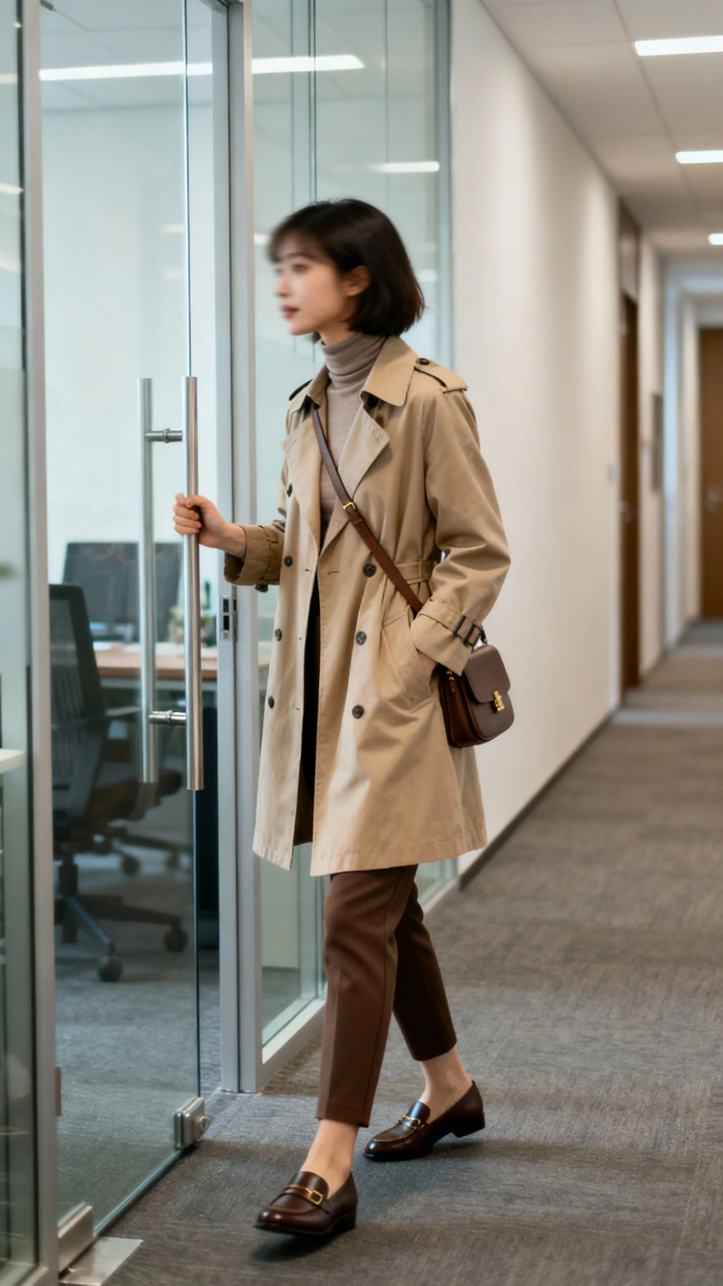 A trench is the ultimate office layer, but the classic long version can drown a small frame. The fix? A knee-length or slightly above-the-knee trench over lean basics. It sharpens everything you wear under it and makes you look intentionally put together, fast.
