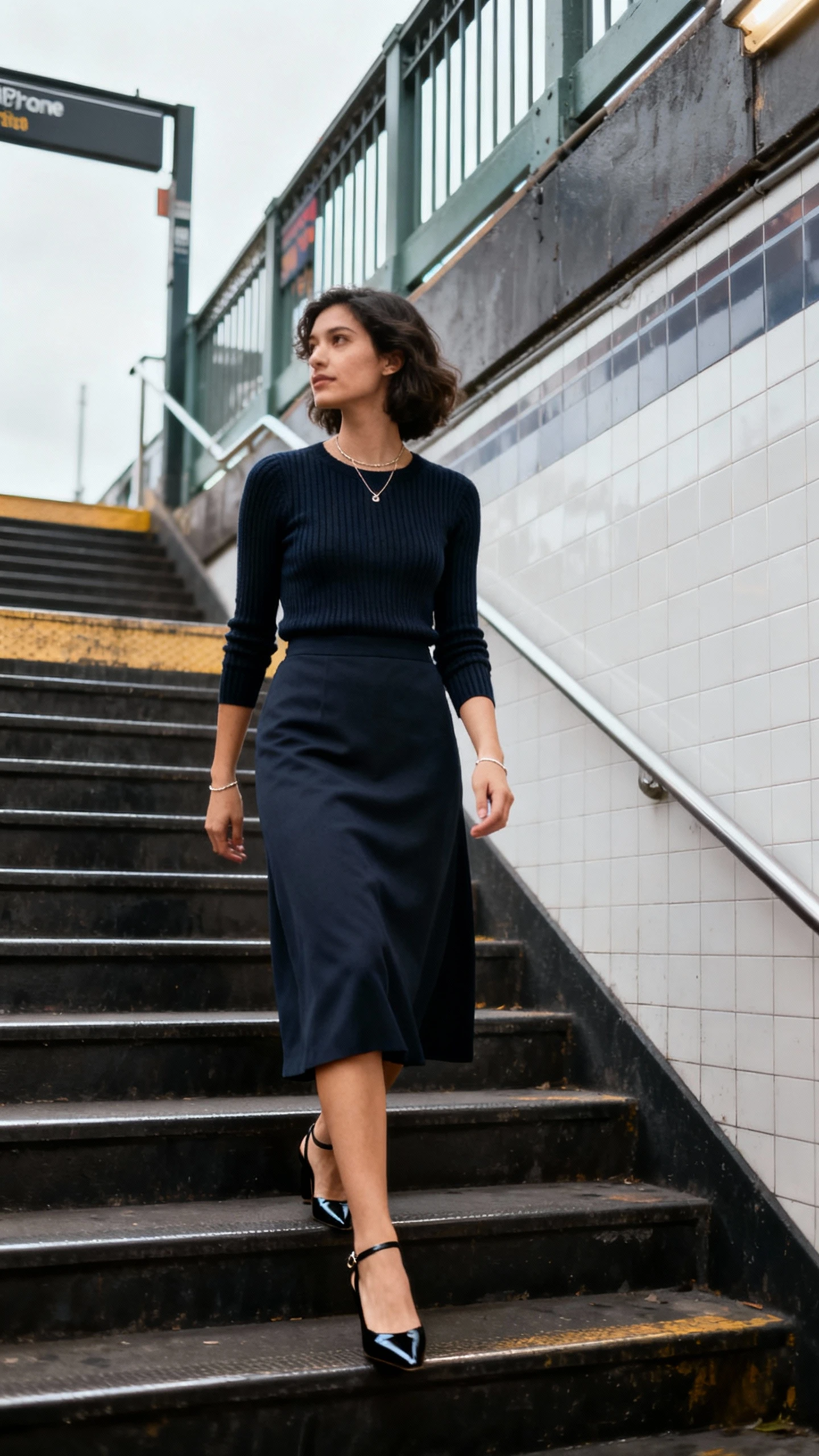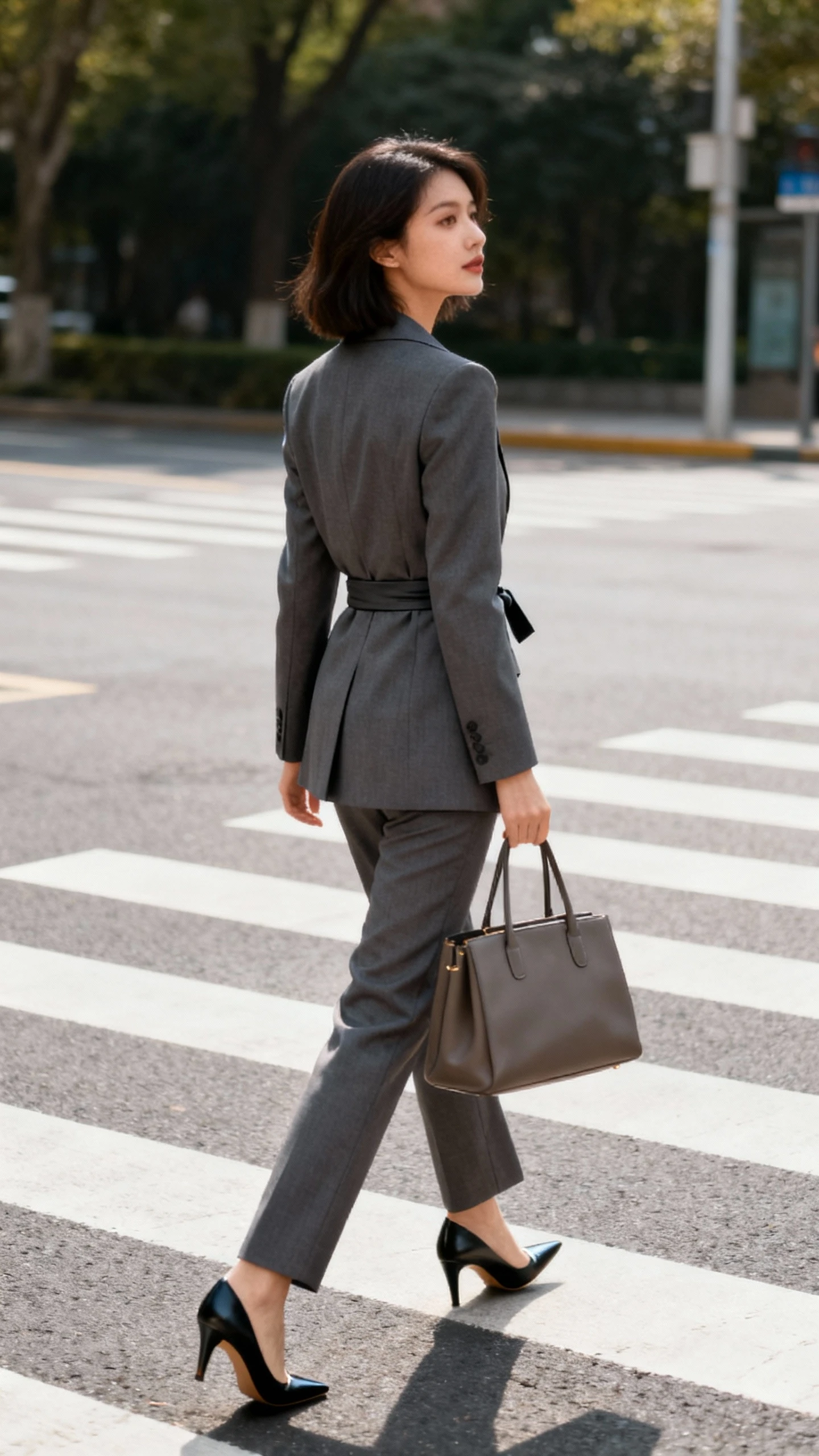 Wear it for big meetings where you want structure without a full blazer. For cooler days, switch the blouse to a fine-gauge turtleneck and add sheer black tights to maintain that long, sleek line.