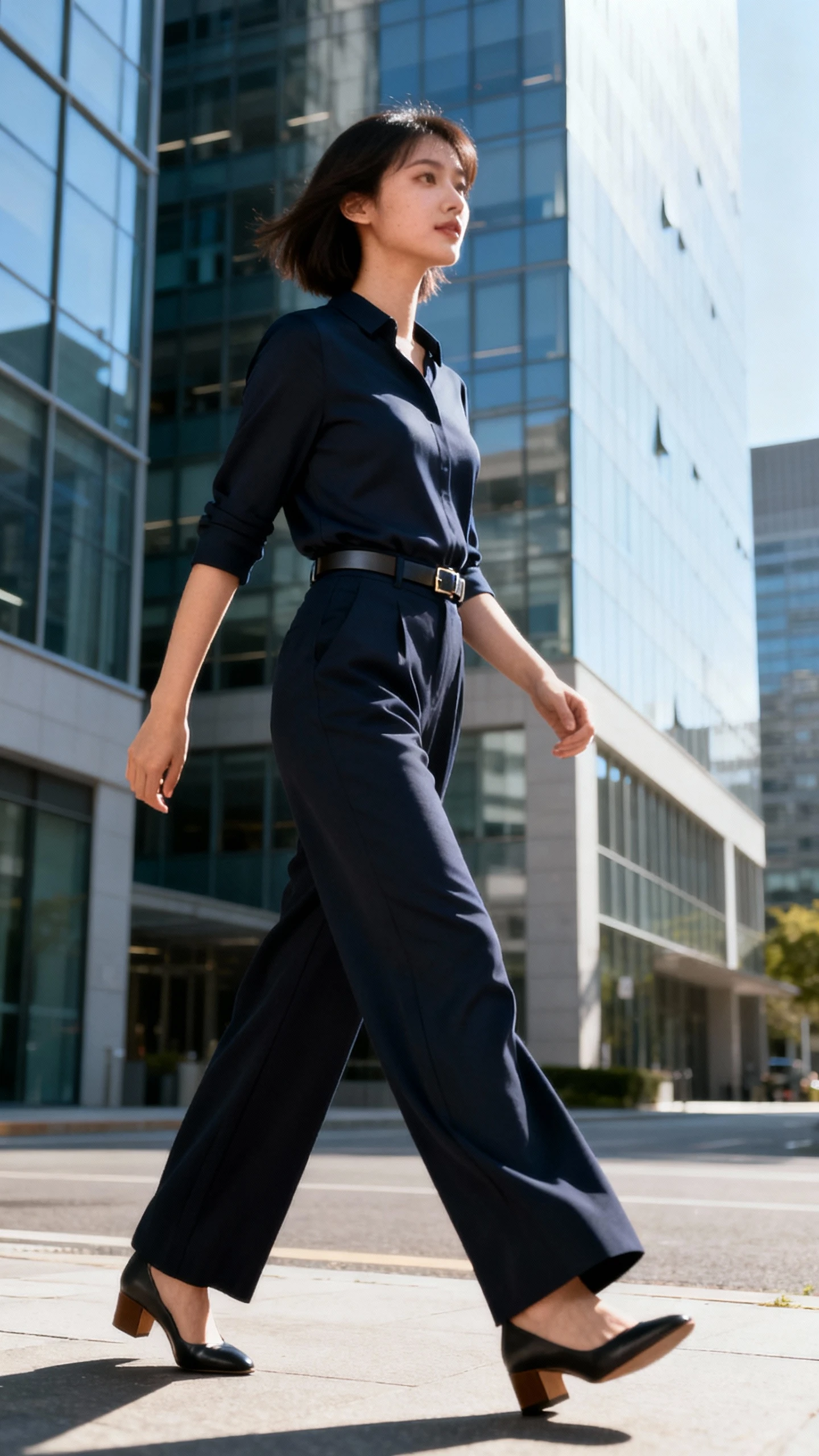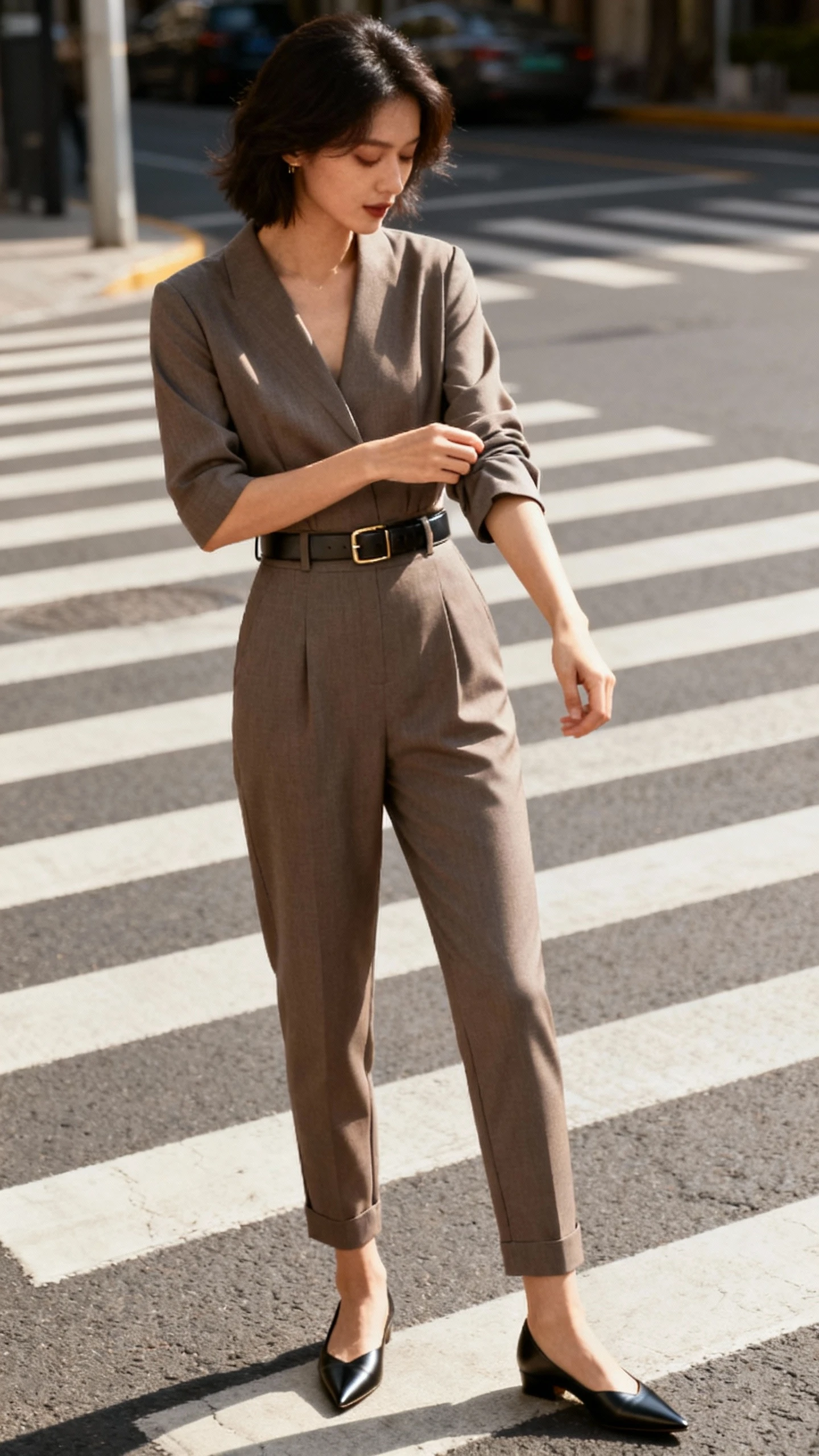 - Minimal belt (optional) in a matching tone