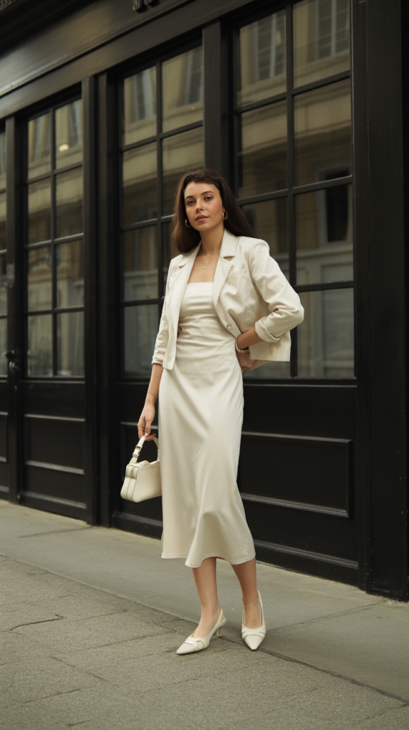 If you love dresses but hate feeling swallowed, this pairing is your best friend. A sleek column dress makes one long line up and down, then a cropped jacket adds structure without overwhelming your frame. It’s elegant, easy, and office-ready with zero fuss.