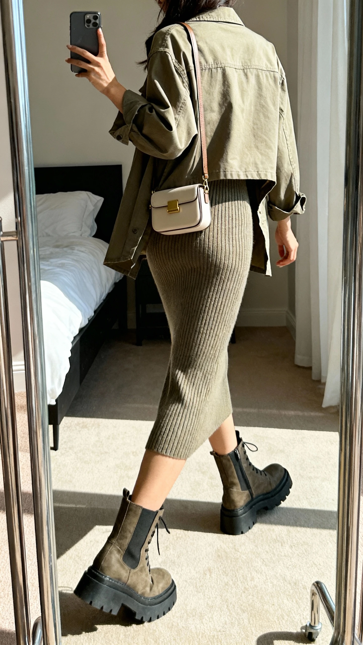 When you want cool-girl edge without losing the quiet luxury vibe, layer your utility shirt like a lightweight jacket. It adds structure to a knit dress and balances chunky boots perfectly.