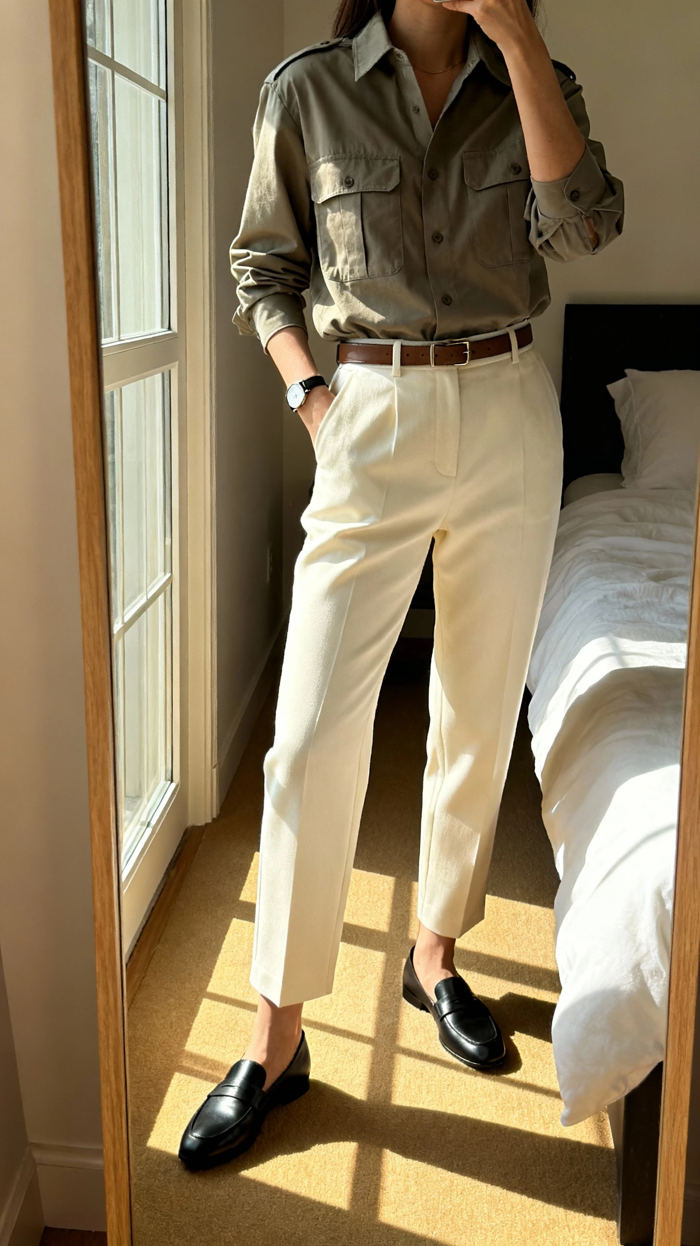 1. Tailored Minimalist Magic With Cream Trousers And Sleek Loafers
