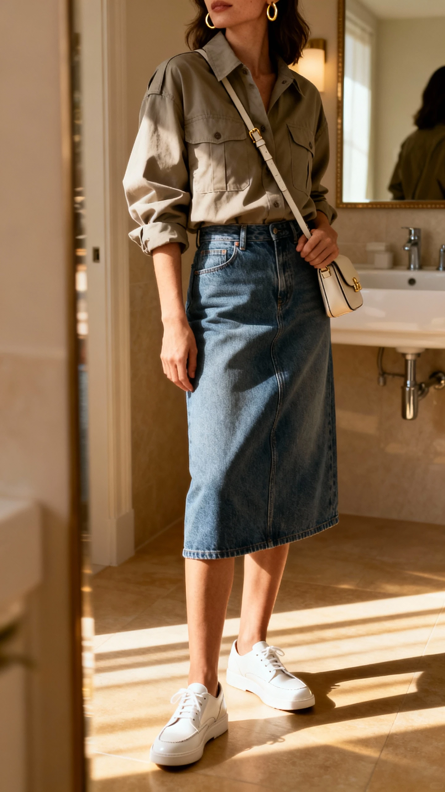 2. Weekend-Perfect: Denim Skirt, Utility Shirt, And Luxe Sneakers