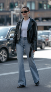 Layer a leather jacket over a fitted tee, pair with bootcut jeans, and add boots. Simple, but the fit is key—make sure the tee isn’t baggy and the jacket hits at the right spot on your waist.