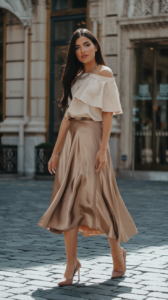 Nothing screams flirty confidence like an off-shoulder top. It broadens the shoulders slightly, balancing your rectangle frame, while a flowy midi skirt adds some motion and curve illusion below.