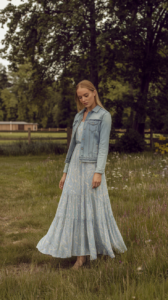 Layer a slim denim jacket over a flowy maxi dress with a cinched waist (hello, thin belt!) and you instantly get dimension and shape. Sneakers, boots, or wedges—your call.