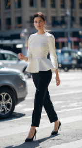 Try a structured peplum top in a bold color with slim black trousers. Throw on heels or pointed flats to keep the line sleek.