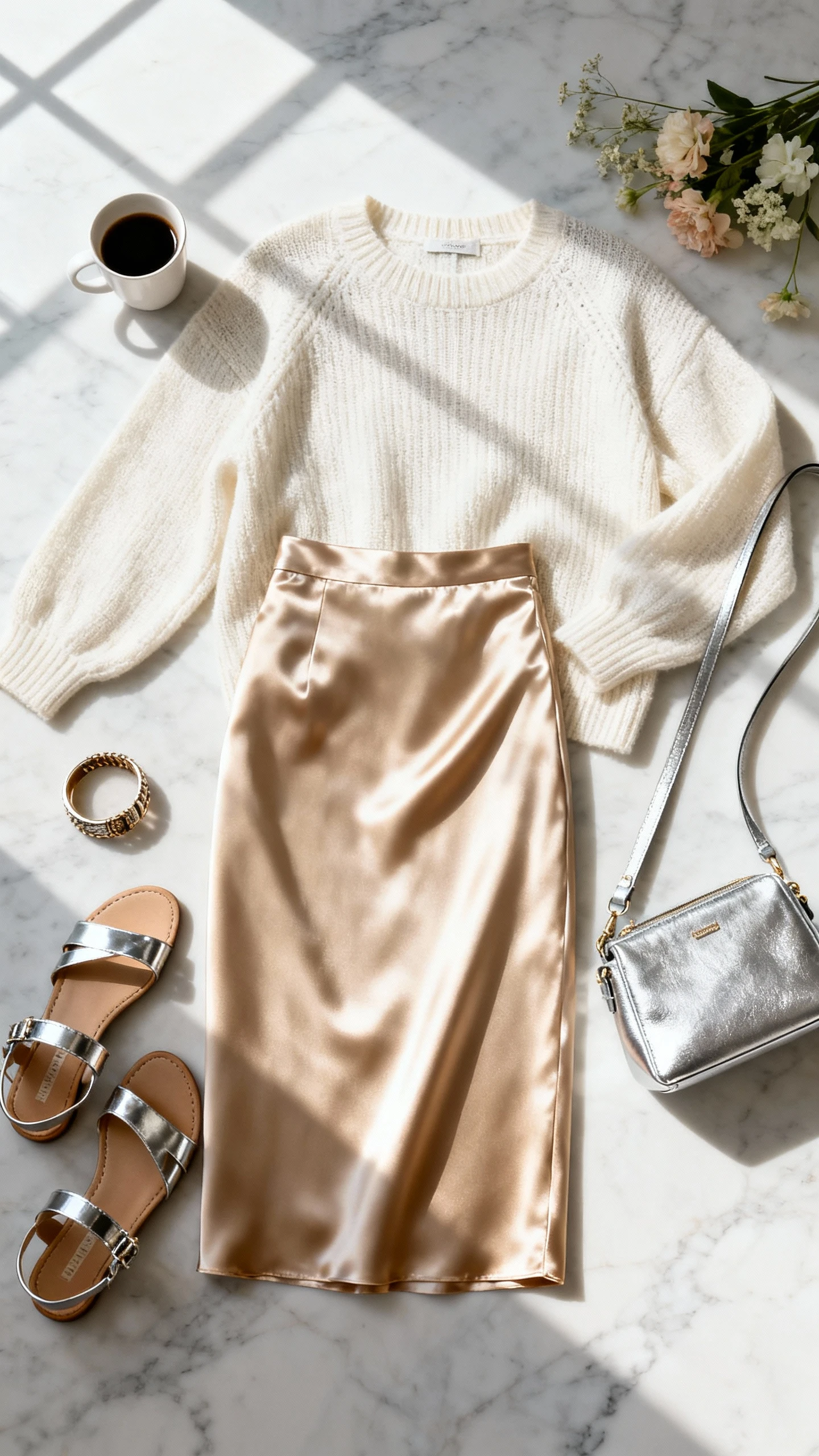 5. Satin Skirt + Cozy Knit With A Metallic Twist